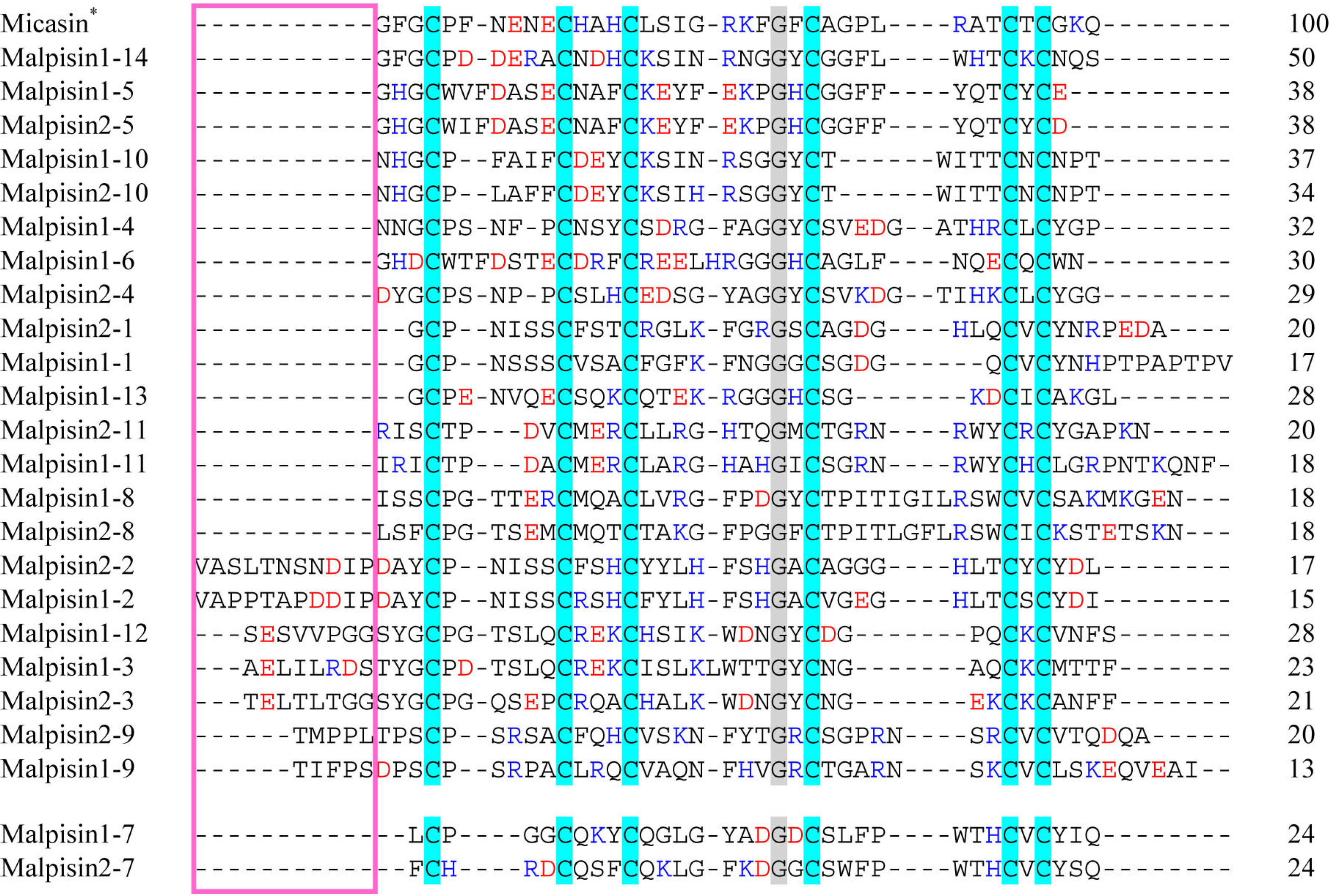 Multiple sequence alignment of malpisins. Color codes and symbol notes used here are the same as those in Figure 2. Pink box indicates the N-terminus of DLPs with variable length. Sequence identity (%) to micasin is shown on the right.