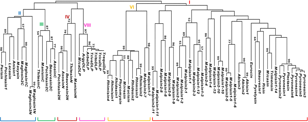 All the fDLPs characterized here have a signal peptide located in the N-terminus. In comparison with fDEF1 and fDEF2 that possess a propeptide located between signal and mature peptides, fDEF6 and fDEF8 lack a propeptide. Five precursors (maglosin, beauvesin2, manisin, pochlasin2 and asosin) could release two defensins from a single precursor after the removal of a spacer propeptide (Figure 5). The malpisin family from Mortierella alpine exhibits two types of precursor organization: (1) the first type contains 10 members, all having a propeptides identified by its acidic feature and single or two basic amino acids at their ends as putative cleavage site of proprotein convertase [11]; (2) the second type contains 14 members that lack a propeptide and thus no further processing step is needed (Figure S1).