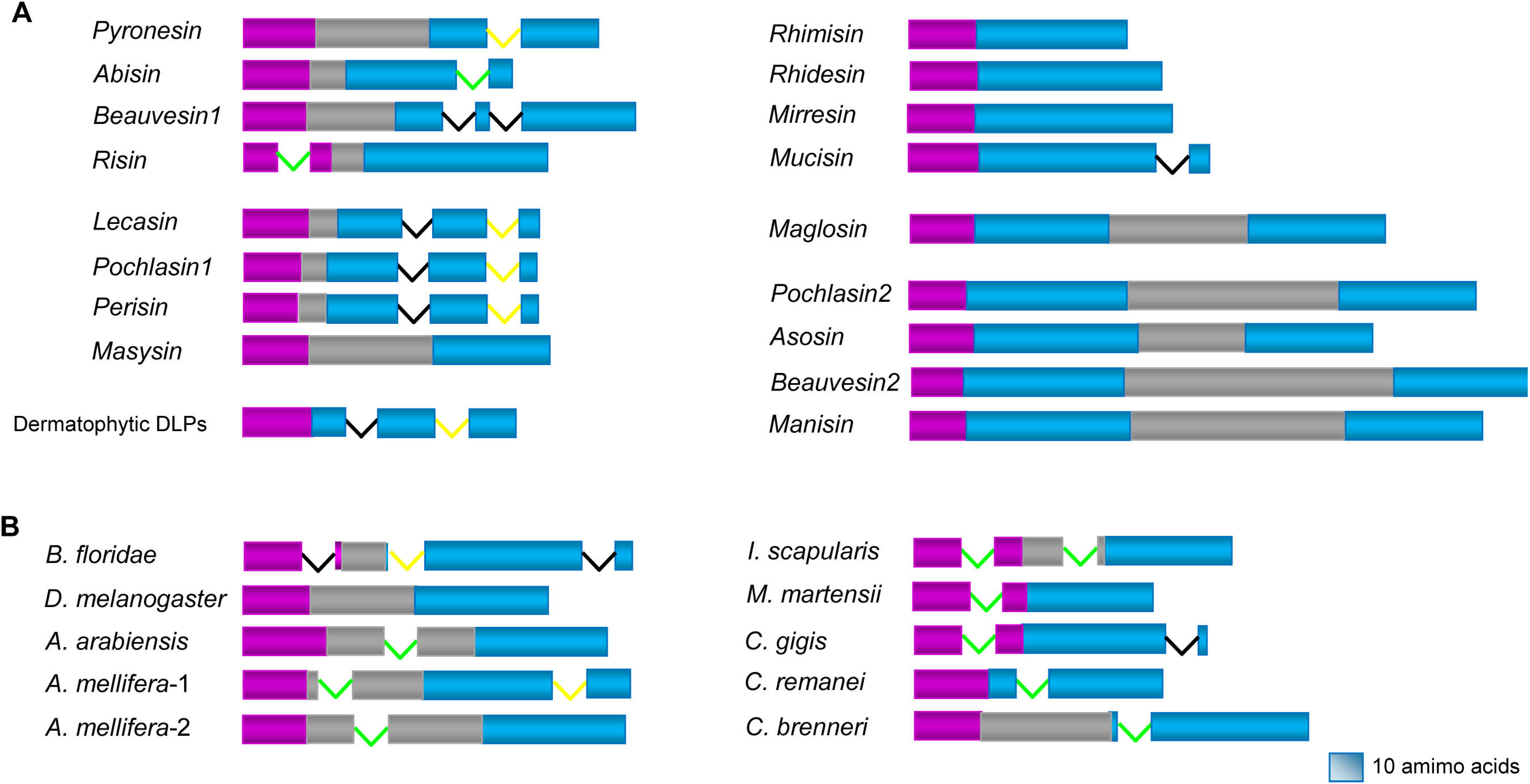 Analysis of the exon-intron structures of the newly-discovered fDLPs revealed their variability that can be described as follows: (1) all the fDLPs retain the integrity of the signal peptide except risin (Rhizophagus irregularis) and malpisin1-1 (or malpisin2-1) that have a phase 1 or phase 0 intron disrupting their signal peptides; (2) all of the genes in fDEF8 and three genes in fDEF2 (i.e., lecasin, pochlasin1 and perisin) have the same gene organization as previously identified dermatophytic defensins (micasin, arbesin, trivesin, tritosin and trirusin) and they contain two introns: the first intron (phase 0) disrupting the α-helical region; the second intron (phase 2) disrupting the c-loop; (3) the pyronesin and abisin multi-gene family in fDEF1 have only one intron disrupting either the α-helical or the c-loop region; (4) In addition to these intron-containing fDLP genes, there are some members without introns (Figure 2 and Figure 5).