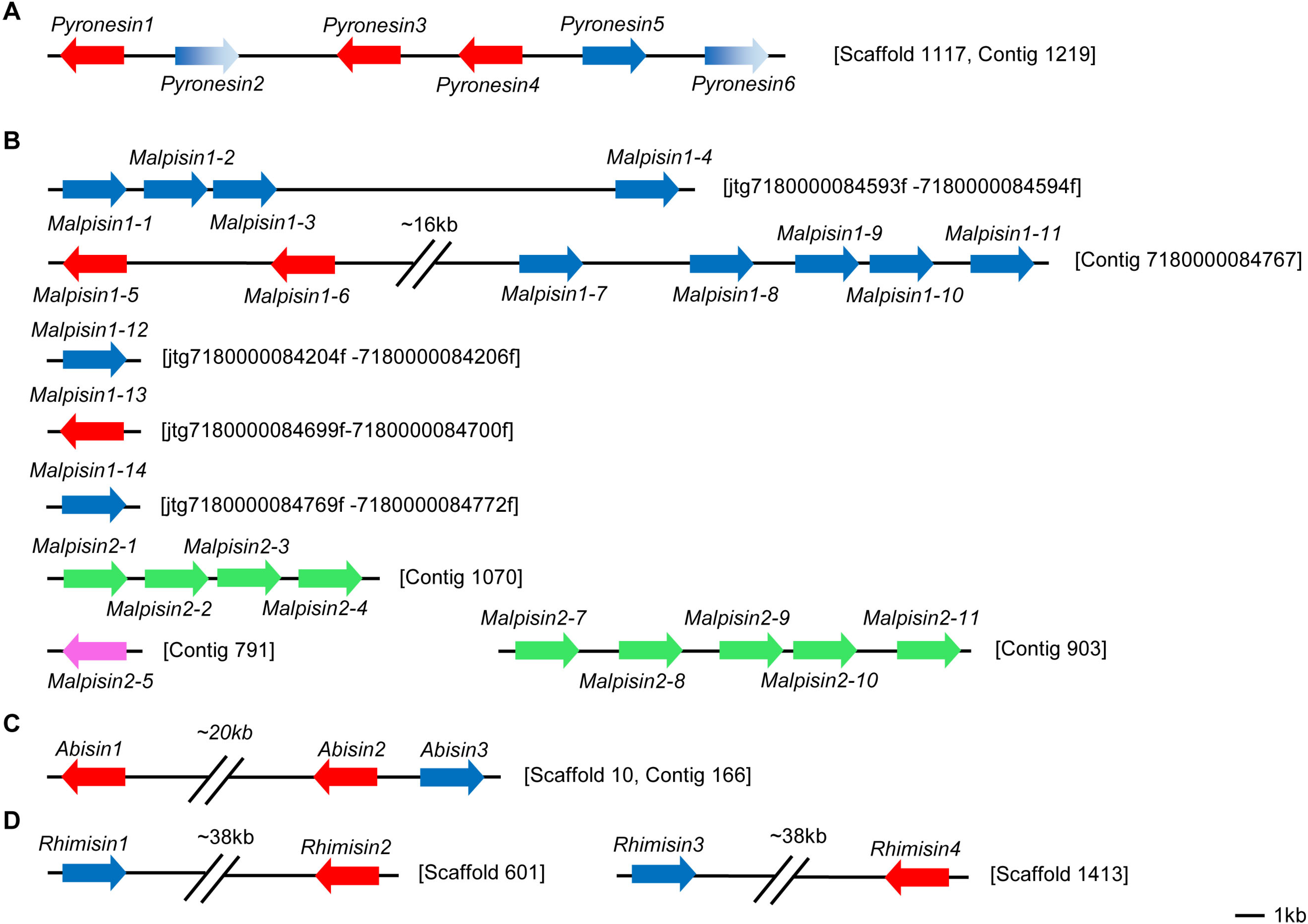 The arrangement of defensin genes in chromosomes. Color arrows refer to different orientation of the genes. A to D represent the genome location of defensins in four species: Pyronema omphalodes, Mortierella alpine, Agaricus bisporus and Rhizopus microsporus. Malpisins in M. alpine B6842 is indicated in red and blue while in pink and green in M. alpine ATCC 32222. Pseudogenes of pyronesins are shown in gradient blue.
