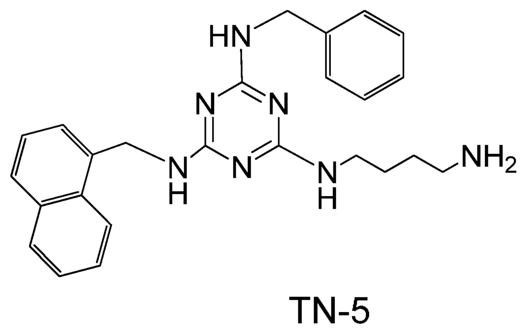 TN-5, N2-(4-Aminobutyl)-N4-benzyl-N6-naphthalenemethyl-2,4,6-triamino-1,3,5-triazine (Figure 1), white solid, was synthesized using an orthogonal synthetic approach based on cyanuric chloride stepwise reaction with naphthalenemethylamine, benzylamine and Boc-1,4-diaminobutane as documented previously [32]. In brief, (i) cyanuric chloride was mixed with naphthalenemethylamine (1.1 eq) in tetrahydrofuran (THF) at 0 °C, and N,N-diisopropylethylamine (DIEA) (2 eq). After 1 hour of stirring, the solution was extracted with water/ethyl acetate and product 2, 4-dichloro-N6-naphthalenemethylamino-1,3,5-triazine was purified using flash column chromatography. (ii) PAL aldehyde resin was mixed with benzylamine (5 eq.) in THF with 2% of acetic acid and shaked at room temperature for 1 h. At the end of the hour, NaB (OAc) 3H (7 eq.) was added and mixed at room temperature overnight. (iii) The product on resin (4 eq) was mixed with 2, 4-dichloro-N6-naphthalenemethylamino-1,3,5-triazine in THF and heated at 60 °C for 3 h. (iv) Resin from last step was mixed with Boc-1,4-Diaminobutane (10 eq) and DIEA (30 eq) in N-methylpyrrolidinone-N-butanol (NMP:n-BuOH) (1:1) and heated for 3 h at 120 °C. (v) Resin was cleaved with 10% TFA in dichloromethane (DCM) for 30 min. Final product was dried and purified with prep thin layer chromatography (TLC). The identity of TN-5 was confirmed by LC-MS (Agilent 6226 TOF LC/MS Mass Spectrometer, Agilent Technologies Inc., Santa Clara, CA, USA). HRMS m/z: calculated [M + H]+ 428.2557, found 428.2566 (Figure S3). The composition of the product was verified by 1H-NMR (300 MHz, CD3OD): δ 8.10–7.86 (m, 1H), δ 7.8–7.65 (m, 2H), δ 7.55–7.30 (m, 4H), δ 7.30–7.15 (m, 3H), δ 7.18 (s, 2H), δ 5.05–4.92 (m, 2H), δ 4.55–4.40 (m, 2H), δ 3.40–3.25 (m, 2H), δ 2.90-2.61 (m, 2H), δ 1.65–1.40 (m, 4H) (Figure S4).