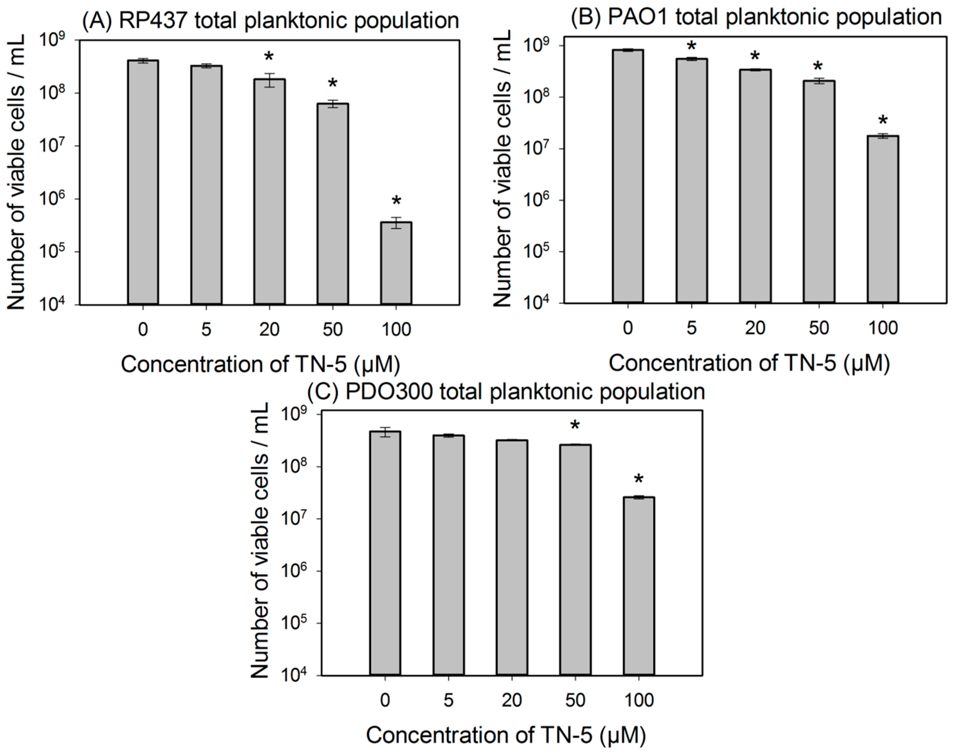 Effects of TN-5 on persister cells of E. coli RP437 (A), P. aeruginosa PAO1 (B), and PDO300 (C). The persister cells were isolated by treating exponential cultures of E. coli RP437 with 100 µg/mL ampicillin and overnight P. aeruginosa cultures with 200 µg/mL ciprofloxacin (both for 3 h). All significant differences (compared to the TN-5 free control) with p < 0.01 are marked with an asterisk.