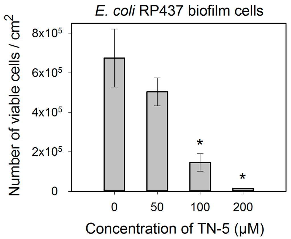 Effects of TN-5 on E. coli RP437 biofilms. The biofilms were cultured for 24 h in LB on stainless steel coupons prior to treatment with TN-5. All significant differences (compared to the TN-5 free control) with p < 0.01 are marked with an asterisk. Note: Data are plotted in linear scale.