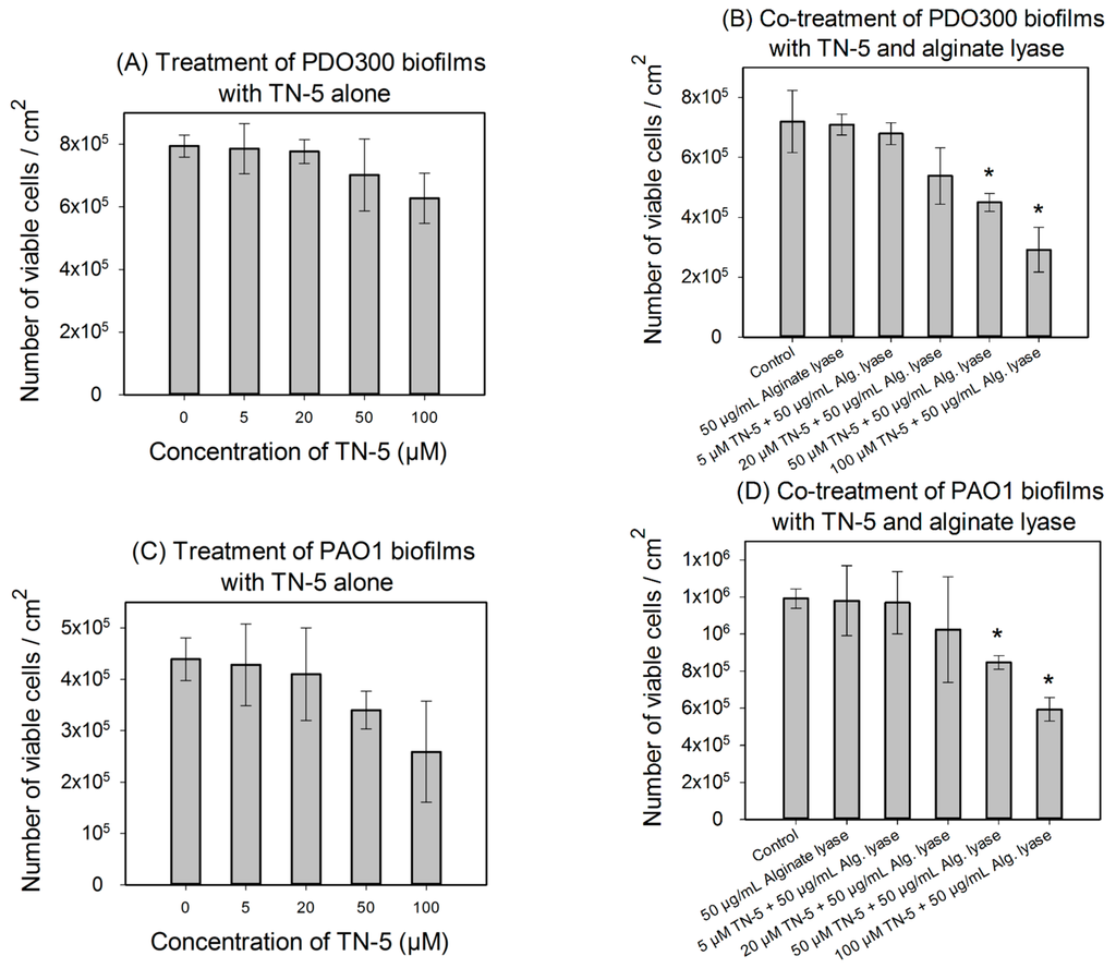 We speculated that the lack of antimicrobial effects against P. aeruginosa biofilms is because of the presence of biofilm matrix. Alginate is a major component of biofilm matrix of the mucoid P. aeruginosa strains [13,33]. Thus we tested the concurrent treatment of P. aeruginosa biofilms with alginate lyase and TN-5. As shown in Figure 5B,D, alginate lyase itself showed no effect on the viability of biofilm cells (p = 1). However, the combination of TN-5 with alginate lyase increased the killing of PDO300 biofilms; e.g., addition of 50 µM alginate lyase increased the activity of 50 µM TN-5 on P. aeruginosa PDO300 biofilms from no significant killing (p = 0.58) to 36.5% ± 4.6% (p < 0.005) and that of 100 µM TN-5 from insignificant killing (p = 0.12) to 57% ± 9.6% (p < 0.005), respectively (Figure 5A vs. Figure 5B). The addition of alginate lyase did not show the same effects on P. aeruginosa PAO1 biofilm cells; e.g., 50 µM alginate lyase did not increase the effects of 50 and 100 µM TN-5 (p > 0.1) (by comparing the % of killing based on corresponding data between Figure 5C,D). This is likely because alginate is not a major component of its biofilm matrix.