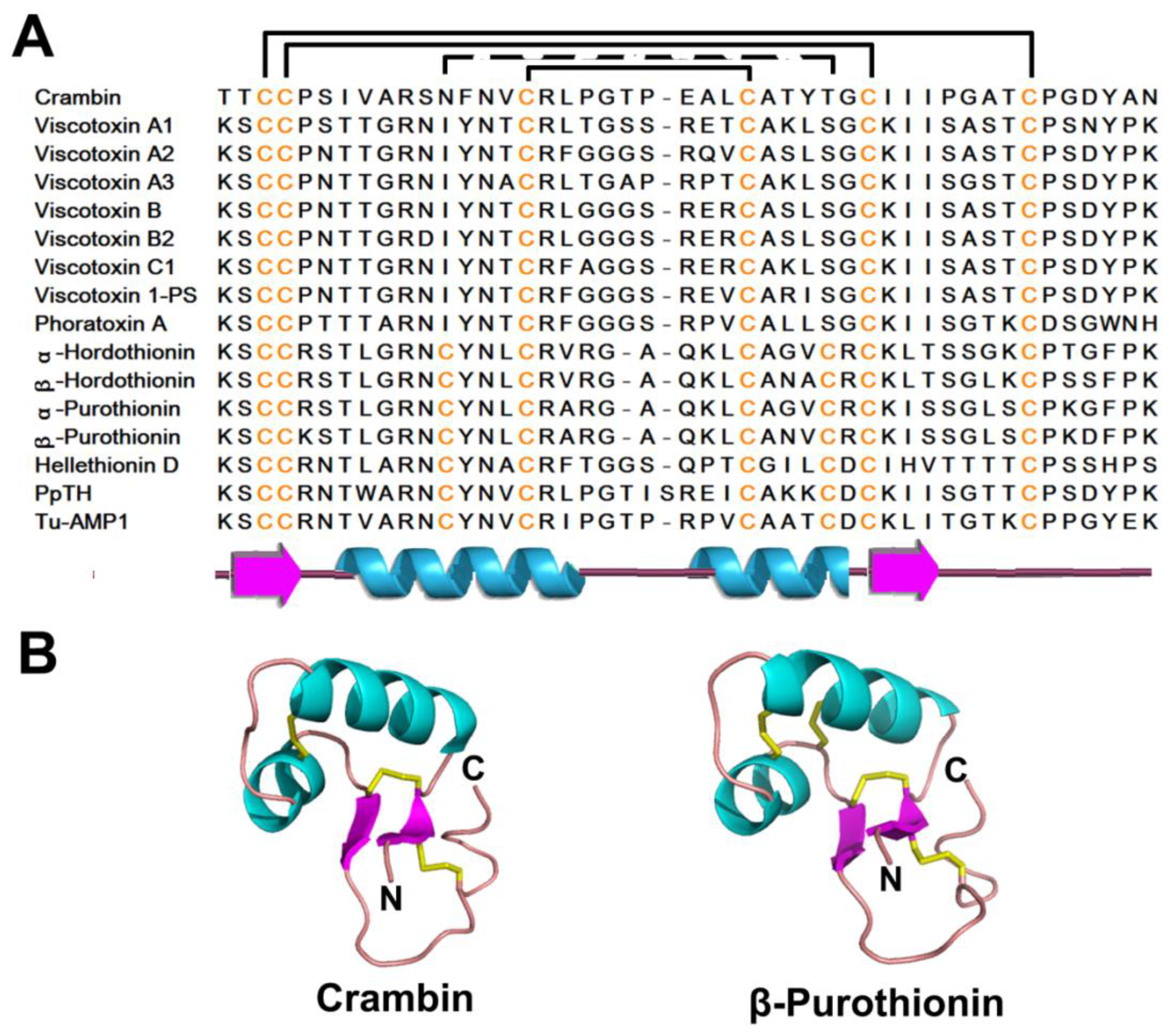 Sequences (A) and structures (B) of representative thionins. The secondary structure is represented by different colors: cyan-α helix; magenta-β strand; pink-random coil and yellow-disulfide bonds.