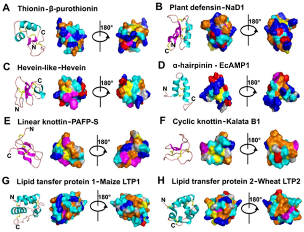 Plant AMPs are divided into families based on their sequence similarity, Cys motifs, and distinctive disulfide bond patterns which, in turn, determine their tertiary structure folding. Table 1 lists the major families of plant AMPs based on these criteria; families include thionins, defensins, hevein-like peptides, knottin-type peptides (linear and cyclic), lipid transfer proteins, α-hairpinin families, snakins, and unclassified CRP-AMPs. In addition, non-CRP AMPs, which may be rich in other amino acids, are also described in this review, including the Gly-rich peptide (GRP) Pg-AMP1, the Gly- and His-rich peptide shepherins, and peptides of less than 10 amino acids (aa), such as Cn-AMP1 and Cr-ACP1. The following defining features are found in plant AMPs: