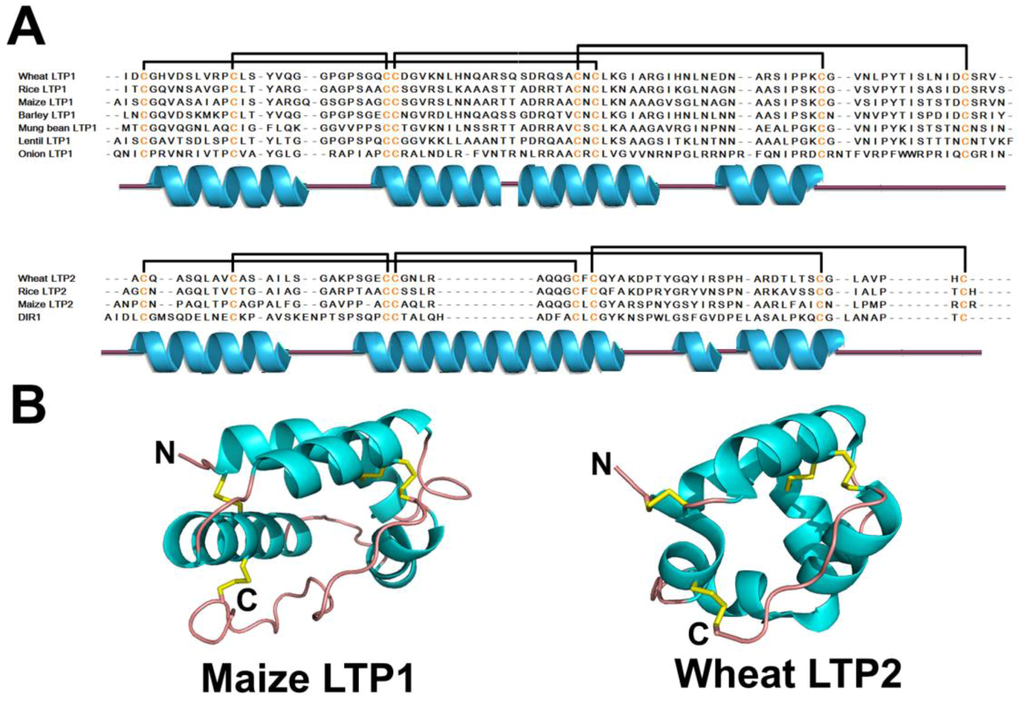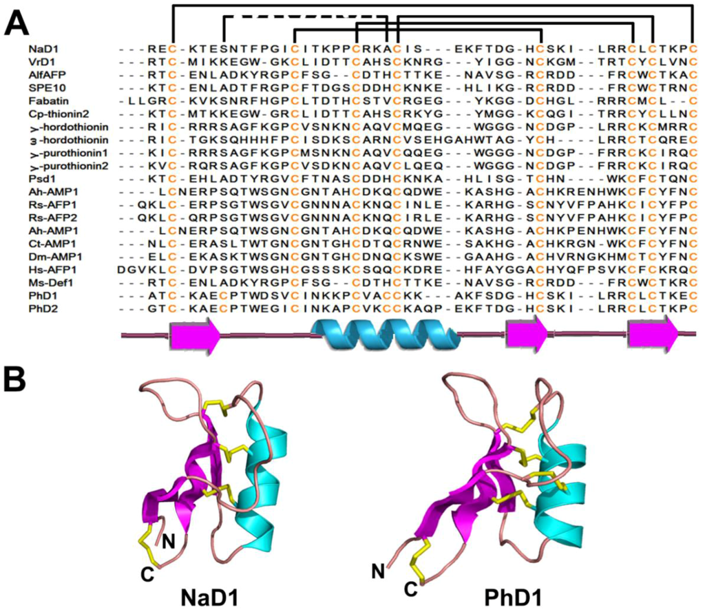 Sequences (A) and structures (B) of representative plant defensins. The secondary structure is represented by different colors: cyan-α helix; magenta-β strand; pink-random coil and yellow-disulfide bonds.