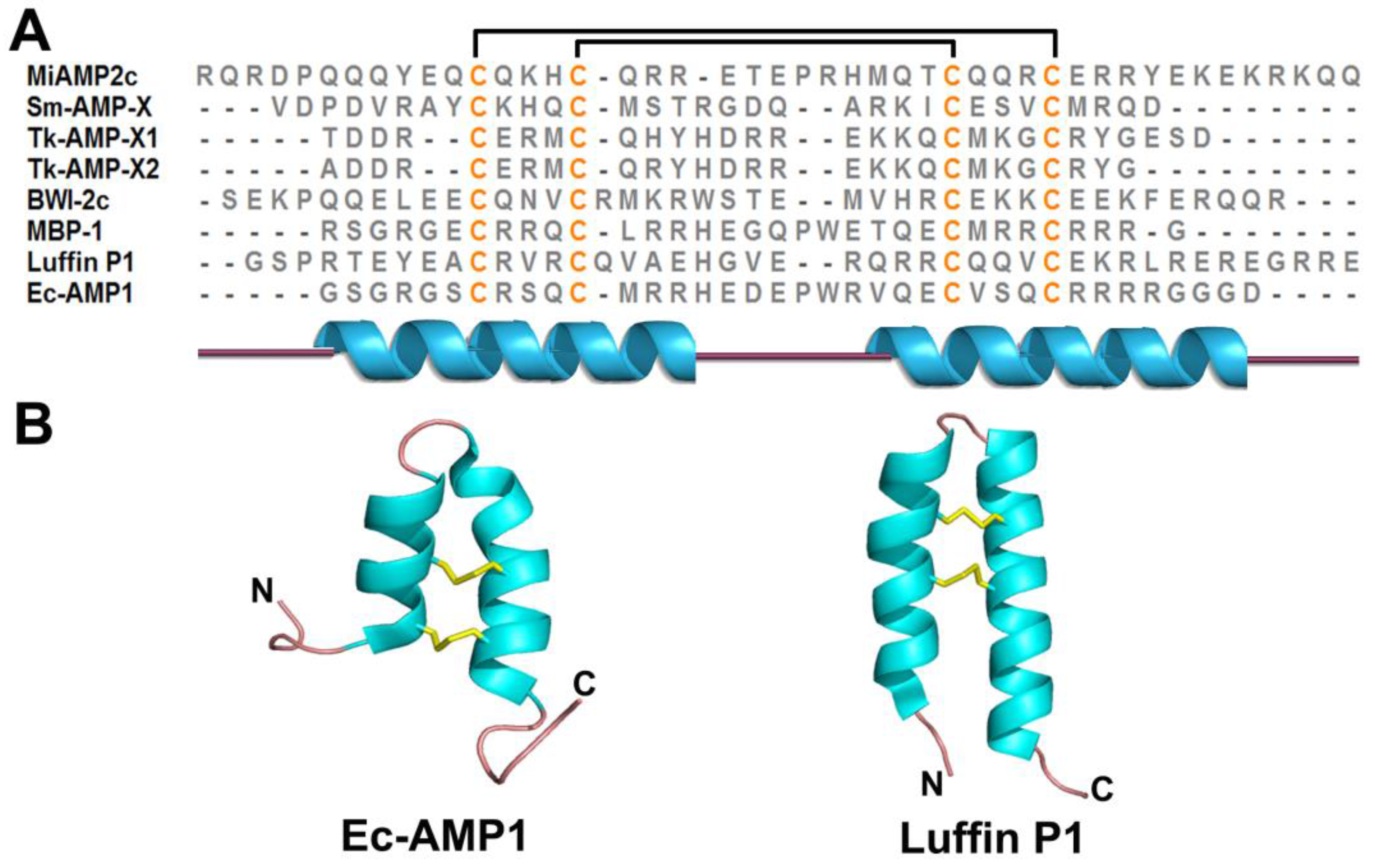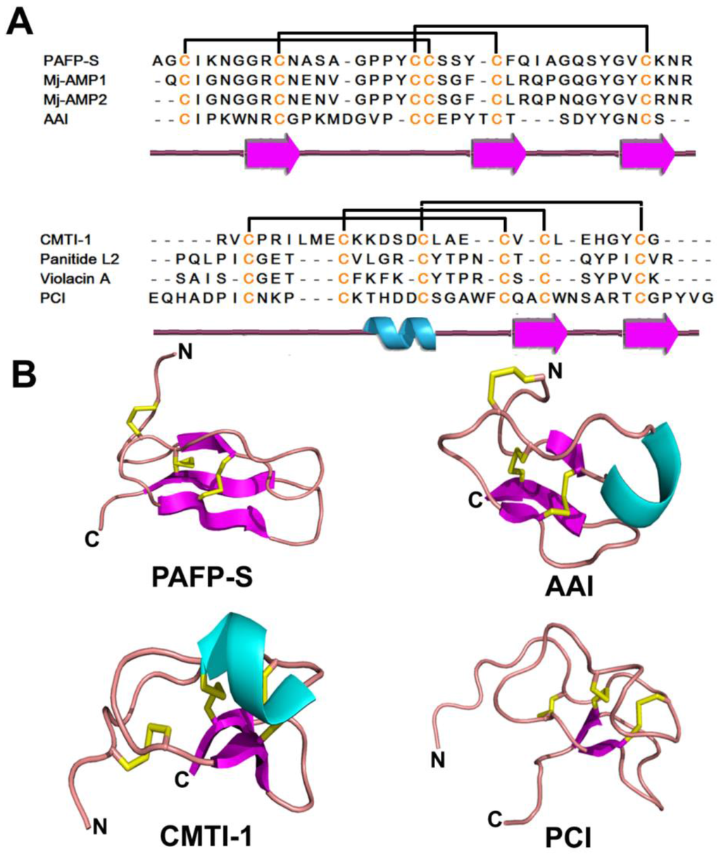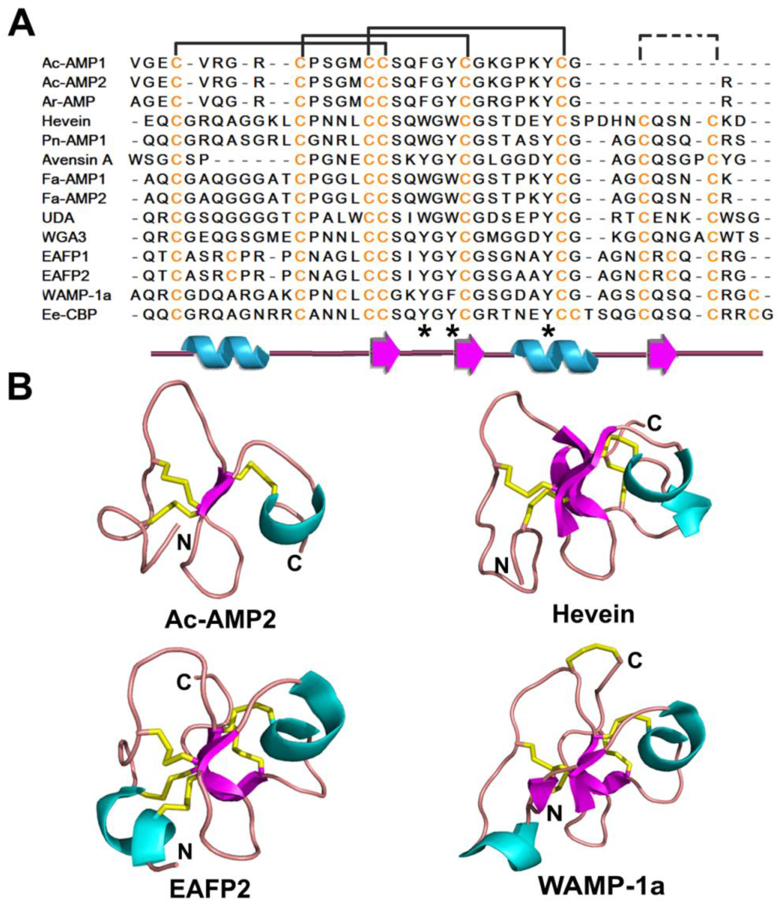 Sequences (A) and structures (B) of representative hevein-like peptides. The secondary structure is represented by different colors: cyan-α helix; magenta-β strand; pink-random coil and yellow-disulfide bonds.