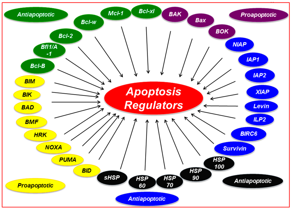 Survival family members associated with regulation of apoptosis. Abbreviations: Mcl-1, myeloid cell leukemia 1; Bcl-xL, B-cell lymphoma-extra-large; Bcl-2, B-cell CLL/lymphoma 2; Bcl-w, Bcl-2 like 2; BIM, Bcl-2 interacting protein; BIK, Bcl-2 interacting killer; BAD, Bcl-2 antagonist of cell death; BID, BH3 interacting domain death agonist; NOXA, Phorbol-12-myristate-13-acetate-induced protein 1; PUMA, p53 upregulated modulator of apoptosis; HRK, harakiri; BOK, Bcl-2 related ovarian killer; BAK, Bcl-2 antagonist killer1; BAX, Bcl-2 associated X protein; IAPs, Inhibitors of apoptosis; HSP, heat-shock protein.