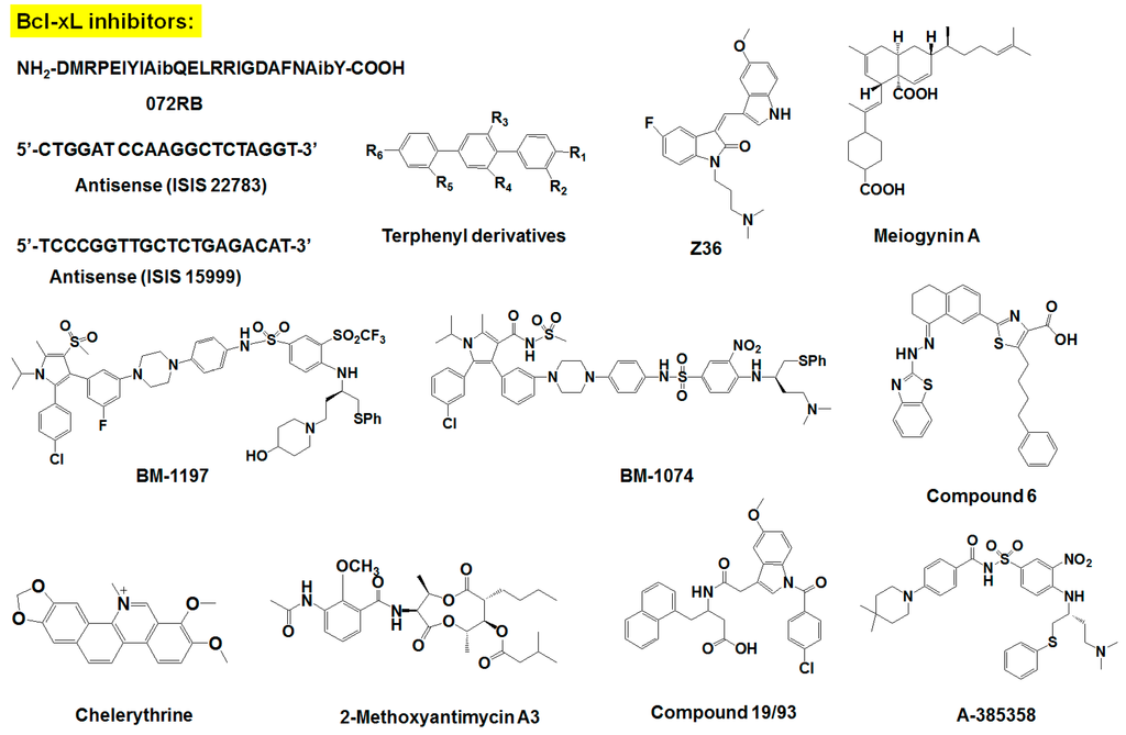 Organic compounds smaller than 900 Da are considered small-molecule compounds. Because of their size, these smaller agents have greater potential than ASOs and peptides as Bcl-2 inhibitors. Several screening strategies have been adopted to find specific small-molecule inhibitors of anti-apoptotic Bcl-2 family members. Most small-molecule inhibitors have been developed as BH3 mimetics, since BH3 binding to the cleft of Bcl-2 are critical for Bcl-2’s anti-apoptotic activities. Small-molecule inhibitors derived from natural products also have shown promising efficacy in variety of cancers [90,91,92,93]. ABT-737, navitoclax, obatoclax, maritoclax, gossypol and its derivatives, and BH3-M6 are some of the small-molecule inhibitors currently in preclinical and clinical phases of development (please see Table 1 and Figure 2).