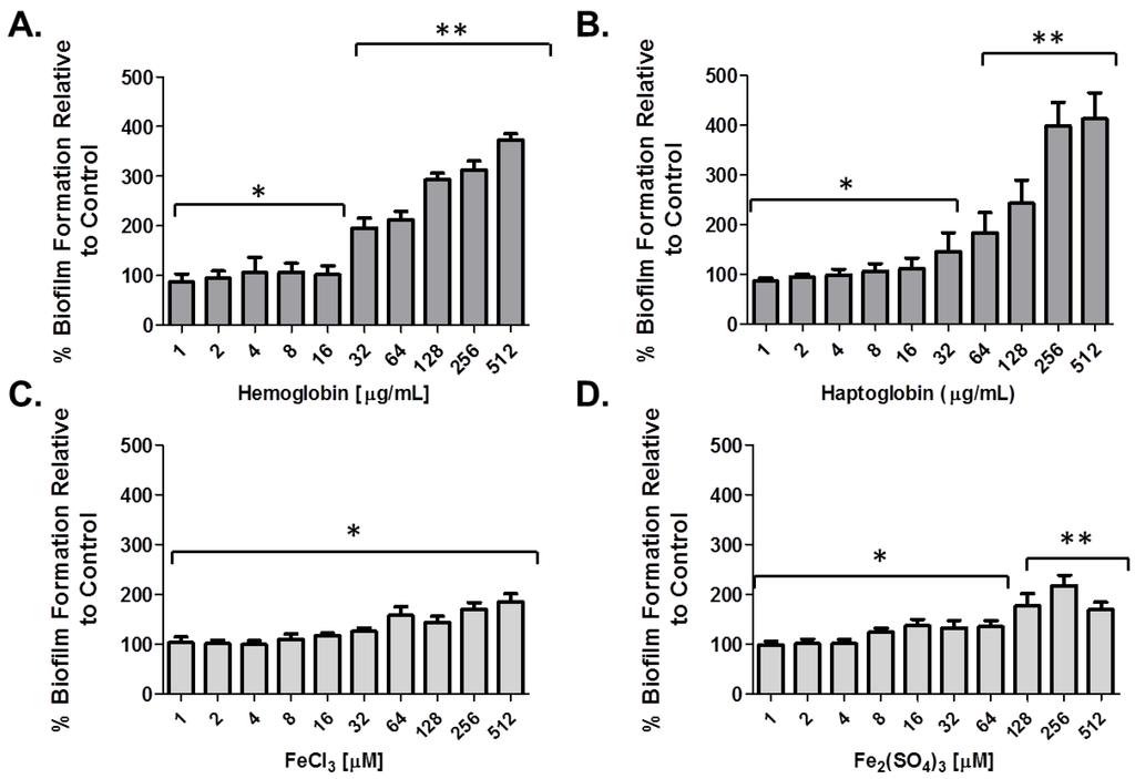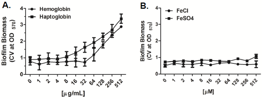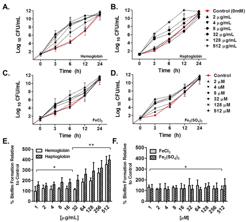 4.3. Effects of Iron Sources on Bacterial Growth and Biofilm Formation