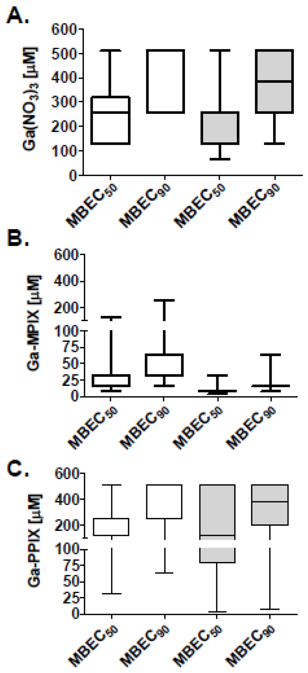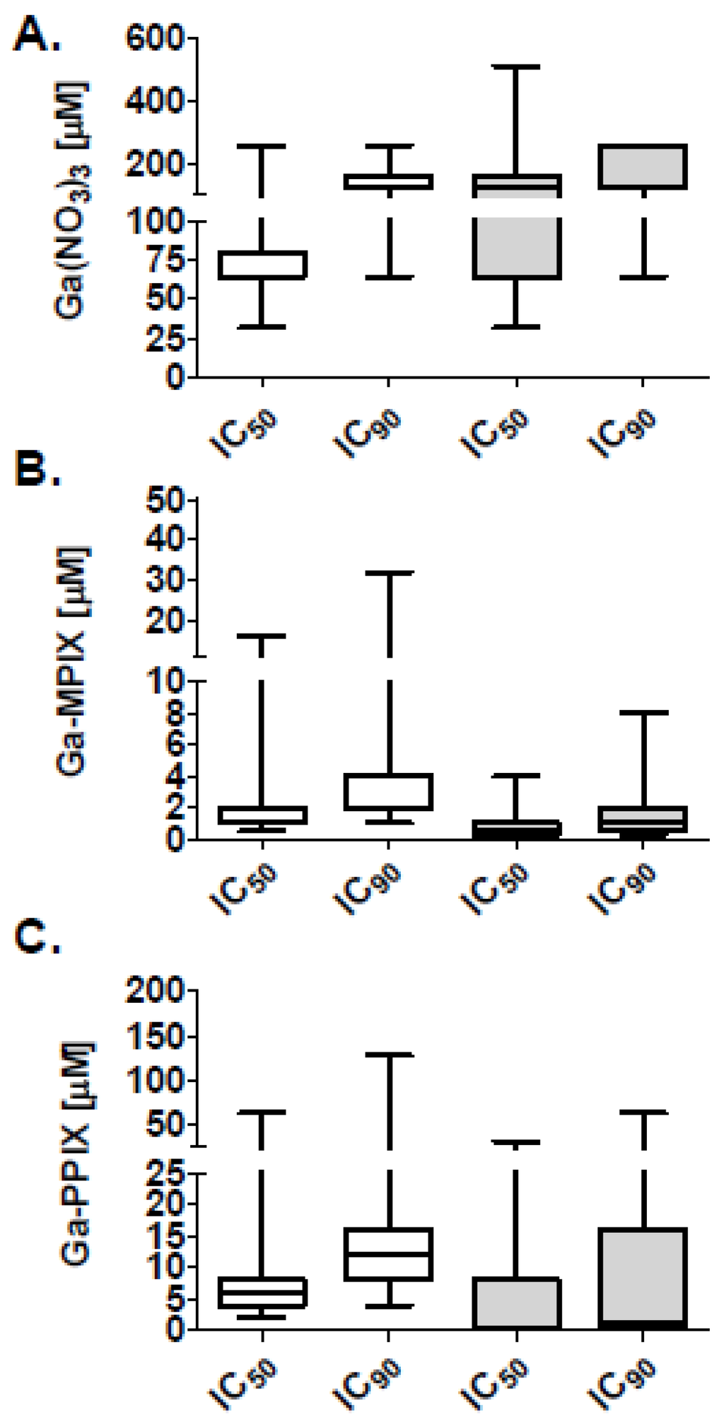 4.4. Activity of Gallium Compounds on Planktonic Bacteria