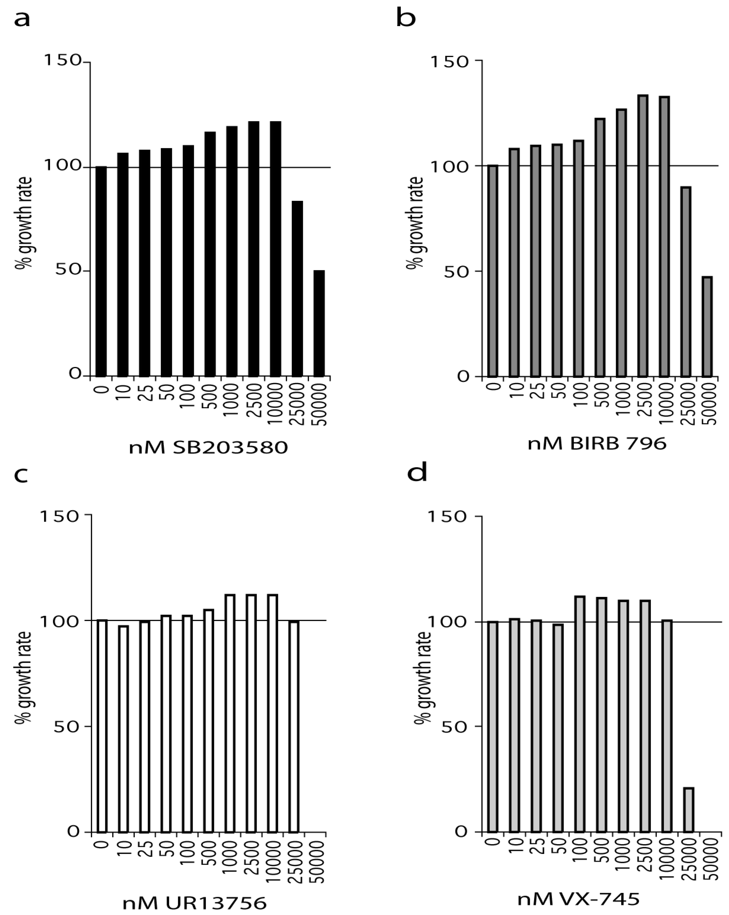 Effects of p38 inhibitors on the growth rate of WStert cells. Data for: (a) SB203580, (b) BIRB 796, (c) UR13756, (d) VX-745; (n = 1). For (a–d) the growth rate for each inhibitor concentration is expressed as a percentage of the DMSO control. The growth experiments for SB203580 and BIRB 796 titrations were repeated independently with the same overall result (see Supplementary Figure S1f, S1g). All growth rates were measured over a 42-day period.