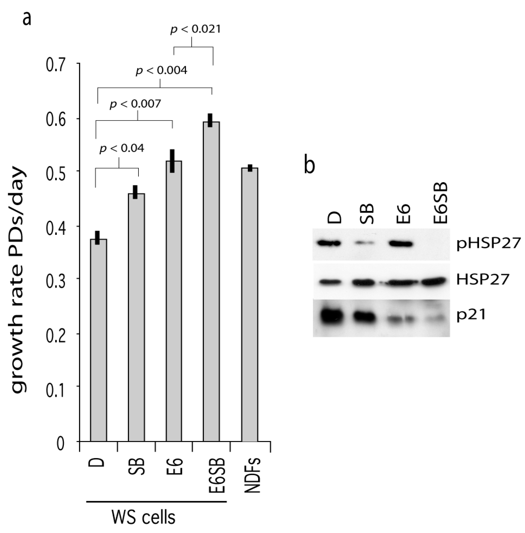 Effects of p53 abrogation on WStert cell growth. (a) Growth rates for WStert and WStert.E6 cells, bars are ± SD (n = 2). D are DMSO treated cells, SB are cells treated with 2.5 µM SB203580, E6 are oncoprotein E6 expressing cells. NDFs are normal cells immortalized using human telomerase and grown in the presence of DMSO. Significance levels given for a subset of comparisons (t-test). (b) Immunoblot for the expression of p21WAF1, HSP27 and phosphorylated HSP27 (pHSP27) in WStert and WStert.E6 cells.