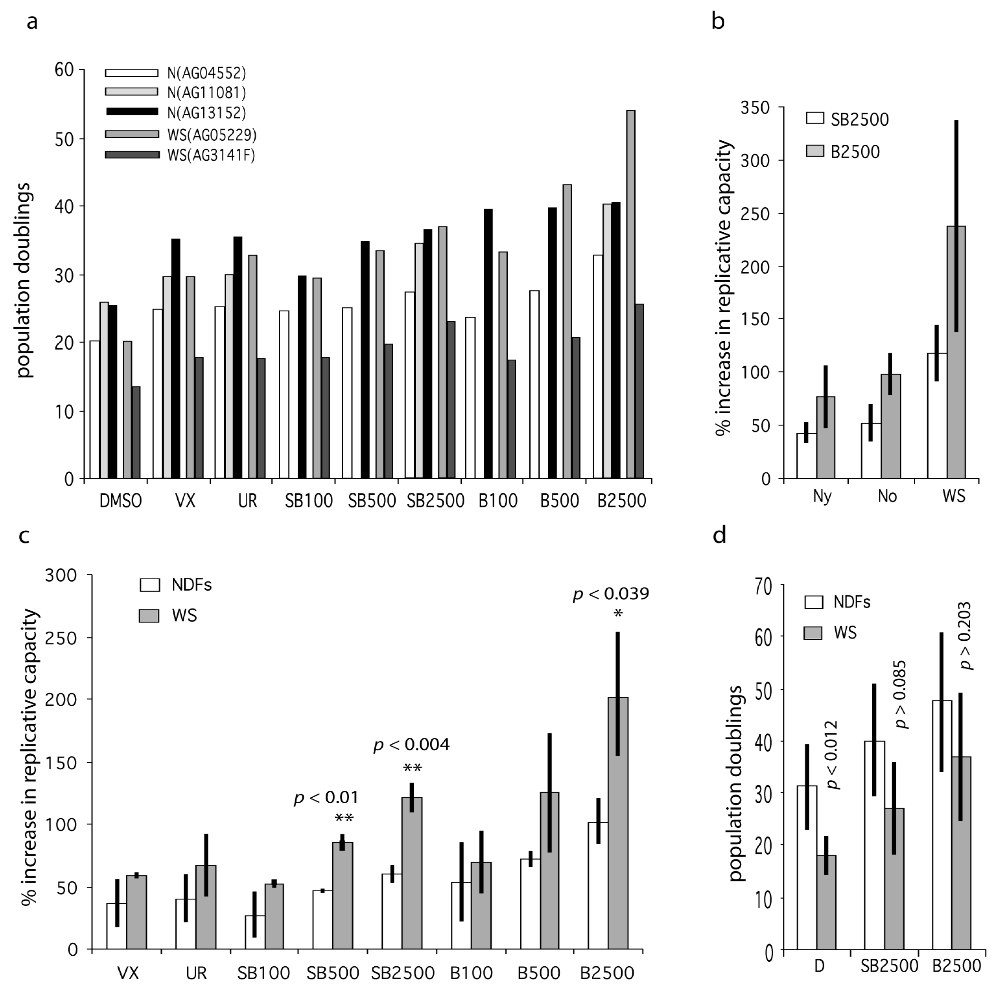 Effects of p38 inhibitors on the replicative capacity of WS and Normal primary fibroblasts. (a) Bar chart showing replicative capacity of fibroblasts from old and WS individuals. DMSO are controls, VX = 500 nM VX-745, UR = 1000 nM UR13756, SB = SB203580, B = BIRB 796; the numbers refer to nM concentrations, e.g., SB100 = SB203580 at 100 nM. (b) Data for the extended data set (Table S4) comparing NDFs from young (Ny) and old (No) individuals with WS. (c) Bar chart showing percentage increase in replicative capacity of fibroblasts from old and WS individuals expressed as mean ± SD (data from Table S3). (d) Mean replicative capacities (expressed as population doublings) of NDFs (all samples from Table S2) compared to WS fibroblasts ± inhibitor treatment. Statistical tests use the null hypothesis that the effects seen for inhibitors using WS fibroblasts are the same as that seen using NDFs, t-test. Significance levels only given for a subset of comparisons: ** highly significant (p < 0.01), * significant (p < 0.05).