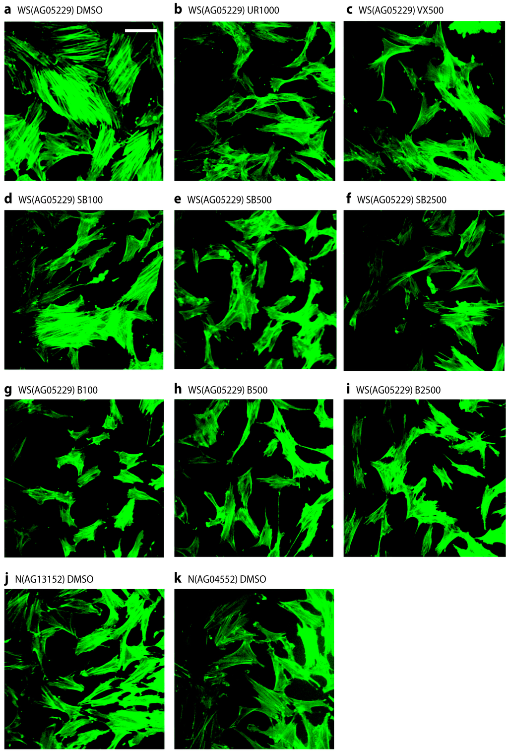 Stress fibre phenotypes of WS(AG05229) cells. Phalloidin stains for WS(AG05229) cells (a–i) and NDFs (j and k). Each panel labeled with strain and inhibitor used (symbols for inhibitors as in legend to Figure 3). These are representative figures from many experiments. Bar = 100 µm for each panel as all are at the same scale. Note: A copy of this figure is also provided as Figure S2 and is available online.