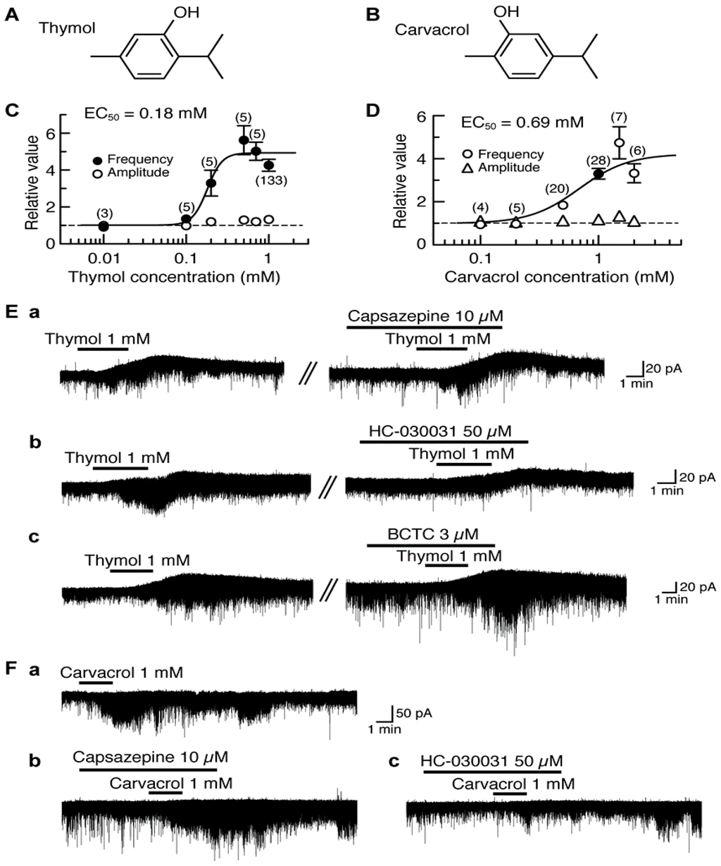 - Xu, Z.-H.; Wang, C.; Fujita, T.; Jiang, C.-Y.; Kumamoto, E. Action of thymol on spontaneous excitatory transmission in adult rat spinal substantia gelatinosa neurons. Neurosci. Lett. 2015, 606, 94–99. [Google Scholar] [CrossRef] [PubMed]