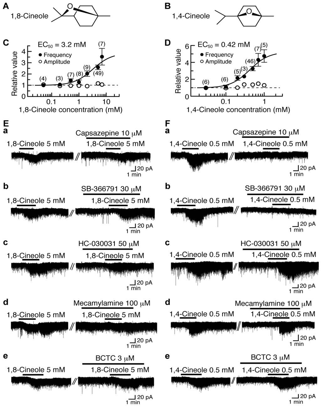 - Jiang, C.-Y.; Wang, C.; Xu, N.-X.; Fujita, T.; Murata, Y.; Kumamoto, E. 1,8- and 1,4-cineole enhance spontaneous excitatory transmission by activating different types of transient receptor potential channels in the rat spinal substantia gelatinosa. J. Neurochem. 2016, 136, 764–777. [Google Scholar] [CrossRef] [PubMed]