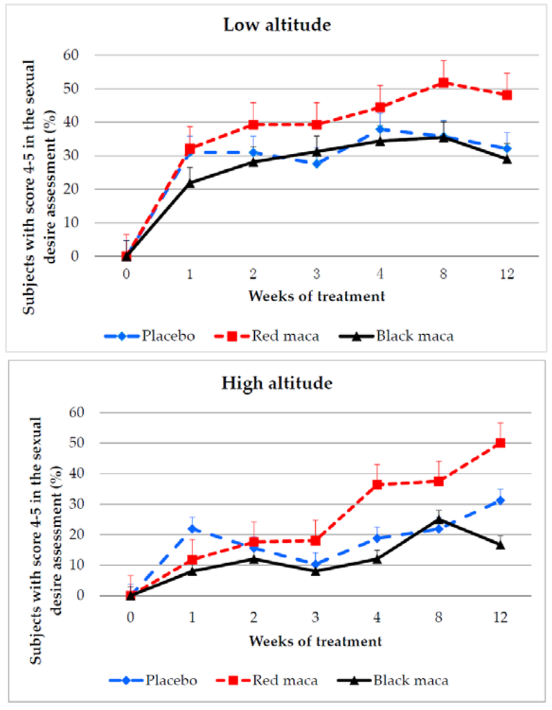 Around 50% of subjects at both altitudes reported an increase in sexual desire at week 12 of treatment with spray-dried red maca extract.