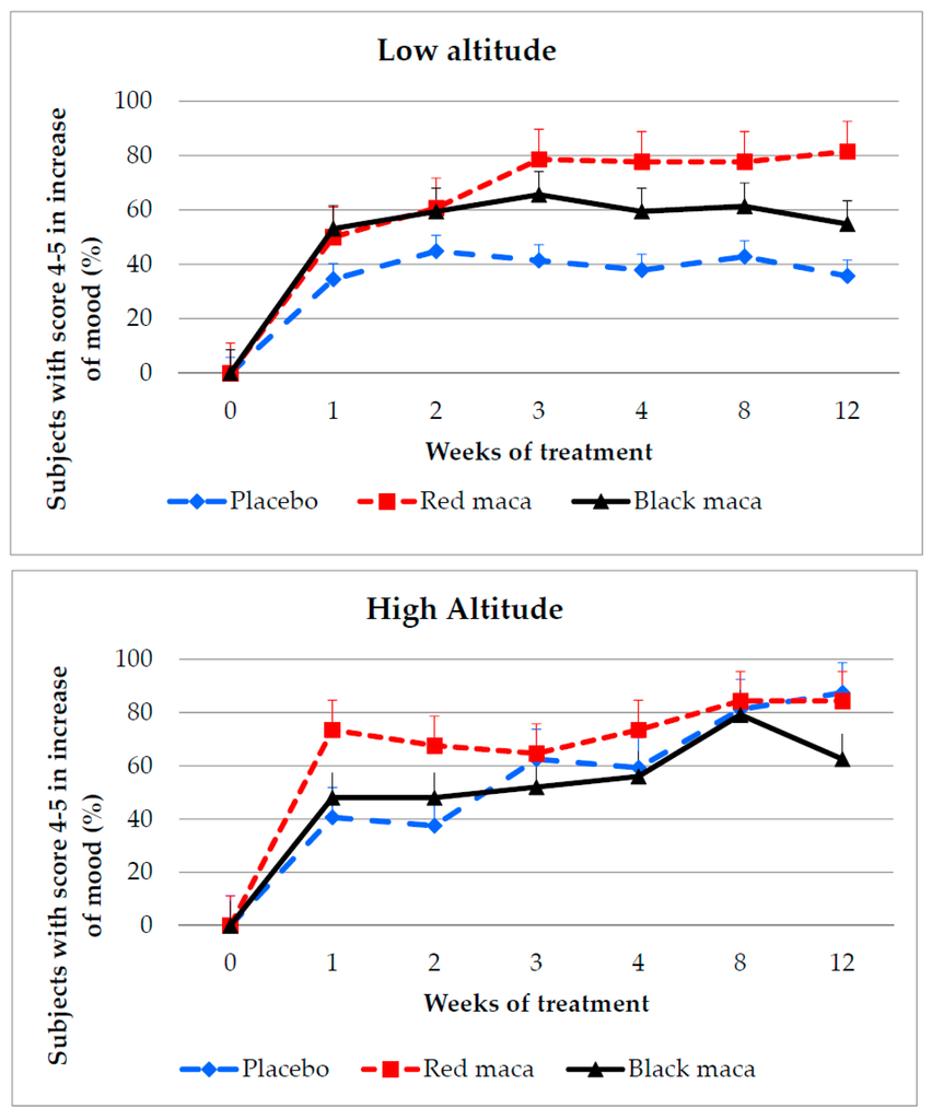 At HA, treatment with the placebo (p = 0.0001), red maca (p = 0.003), and black maca (p = 0.0002) increased the number of subjects with mood improvement over time. However, differences between the group treated with spray-dried extract of red maca and the placebo were observed at weeks 1, 2, and 4.