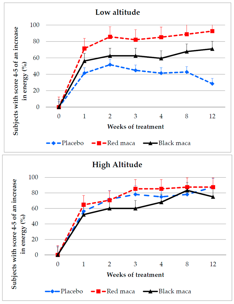 Differences were observed between groups receiving red maca and black maca at weeks 2 (p = 0.04), 4 (p = 0.029), 8 (p = 0.05), and 12 (p = 0.036), with better effects observed with red maca. At week 12, more than 90% of the subjects consuming red maca manifested an increase in energy. Cohen’s d was 1.90 comparing the group receiving the placebo to that receiving red maca. Treatment with red maca versus the placebo resulted in a Cohen’s d of 0.99 and red maca versus black maca resulted in a Cohen’s d of 0.55.