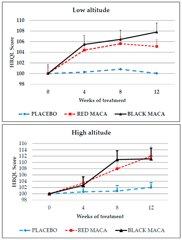 At HA, treatment with the placebo did not modify the HRQL score with respect to the basal values. Treatment with red maca increased the HRQL score at the eighth (p < 0.05) and 12th (p < 0.01) week with respect to basal values. Treatment with black maca increased HRQL score at weeks 8 and 12 with respect to the basal values (p < 0.05). Treatment with black maca (p < 0.05) and red maca (p < 0.05) produced higher increases in HRQL score with respect to the placebo group at eight and 12 weeks (Figure 4 bottom). Participants receiving spray-dried extracts of black maca and red maca showed a similar response.