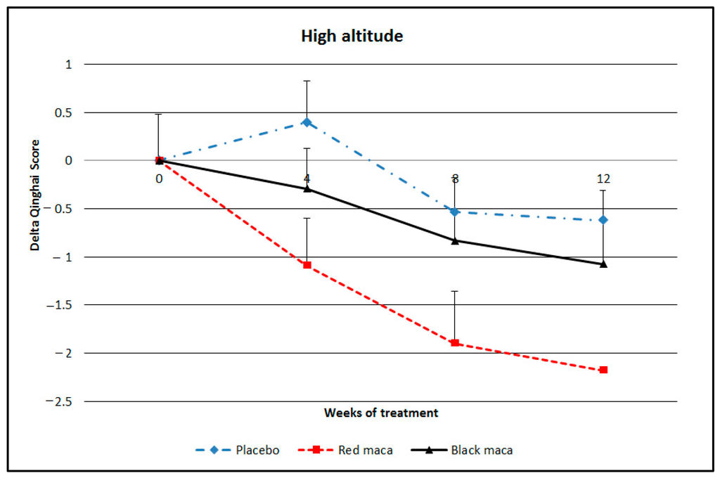 This study was primarily designed to determine the efficacy of oral consumption of extracts of black maca or red maca, a cruciferous plant, during a 12-week period in a double-blind placebo-controlled trial at LA and HA. Secondary objectives of the study were the determination of acceptability, adverse effects, and effect of altitude on outcomes after maca intervention.