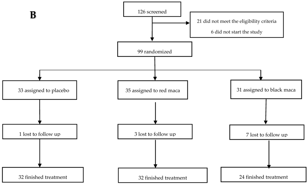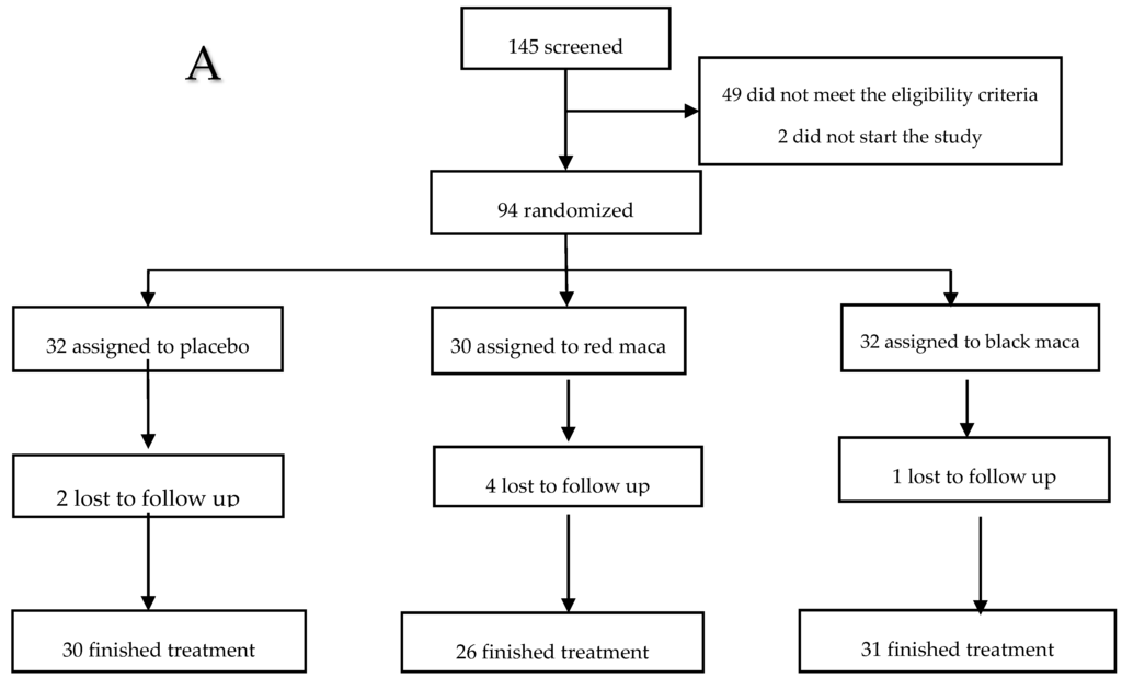 The plant was authenticated by Camilo Díaz, Botanist, Section of Pharmaceutical Sciences, the Faculty of Sciences and Philosophy, Universidad Peruana Cayetano Heredia. The voucher specimen (HEPLAME-MG-2015) was placed at the Section of Pharmaceutical Sciences, University Peruana Cayetano Heredia. Authentication was done by morphological characteristics. In addition, authentication was performed by the presence of glucosinolates and macamides in the hypocotyls of maca by nuclear magnetic resonance (NMR). For this research, spray-dried hydro alcoholic extracts of black maca or red maca was used. For extract preparation, 70% ethanol was used. Maltodextrin was used as the placebo. The dried hypocotyls of maca were used to prepare the extracts. Twenty grams of dried hypocotyls of maca represents almost three grams of the spray-dried extract of maca. Enterprise A-1 del Perú, Industrial Comercial SAC was in charge of preparation of the maca extracts and placebo. The excipient for maca extract was maltodextrin. For this reason, maltodextrin was used as the placebo. According to the protocol, the sachets containing 3 g of powder each were packed in boxes containing 30 sachets by Artpack Perú SAC. Each box (display) was labeled as A, B, or C. Boxes had been kept under appropriate storage conditions at the Research and Development Laboratory building at the Universidad Peruana Cayetano Heredia in Lima and at the Laboratory of the High Altitude Research Institute in Cerro de Pasco. For standardization, maca extracts were submitted to bioassays in mice and rats to determine functional measures of activity.