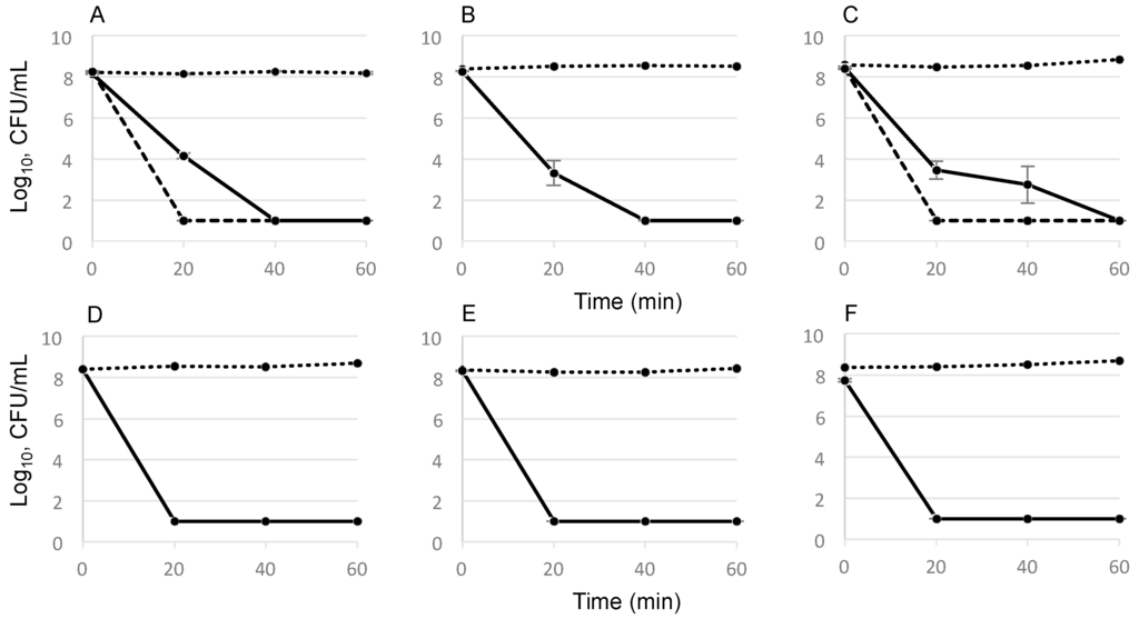 Reduction of the number of E. faecalis bacteria during exposure to GS: (A) control strain DSM 2570; (B) cheese isolate WW4; (C) root canal isolate WW6; and (D–F) clinical tetracycline-resistant isolates TRE1, TRE2, and TRE4, respectively. The bacterial number remained unchanged in the controls (dotted lines), but decreased drastically during exposure to 5 × MIC of GS (solid lines). The dashed lines show the faster bactericidal effect of 10 × MIC for DSM 2570 and WW6 strains; 10 CFU/mL was taken as the detection limit although no colonies were grown from undiluted sample. The standard deviations were calculated from at least two independent experiments.