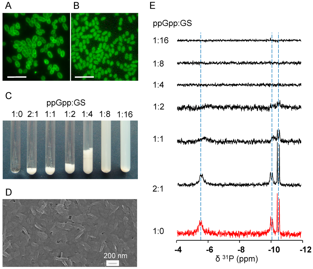 Translocation of GS into the cells and its binding affinity to the bacterial alarmon ppGpp. (A) Green fluorescence of the E. faecalis cell envelope upon staining with the dye CFSE, which cannot penetrate the cellular membrane. (B) Fluorescence throughout the interior of the cells is seen upon staining with a fluorescent GS-sw(FP) analog, confirming that the peptide can translocate across the cell membrane into the cytoplasm. (C) Co-precipitation of GS and ppGpp is seen to occur at roughly equimolar ratios, and a stable opalescent suspension is formed when GS is in large (i.e., electrostatic) excess. (D) SEM showed that the aggregation ppGpp by GS led to the formation of short nano-rods of about 50 nm width and 200 nm length. (E) When GS was added to ppGpp at different molar ratios, the 31P-NMR signals of the latter disappeared successively. The pure ppGpp sample (1:0) is shown in red. The scale on the fluorescent images is 5 μm.