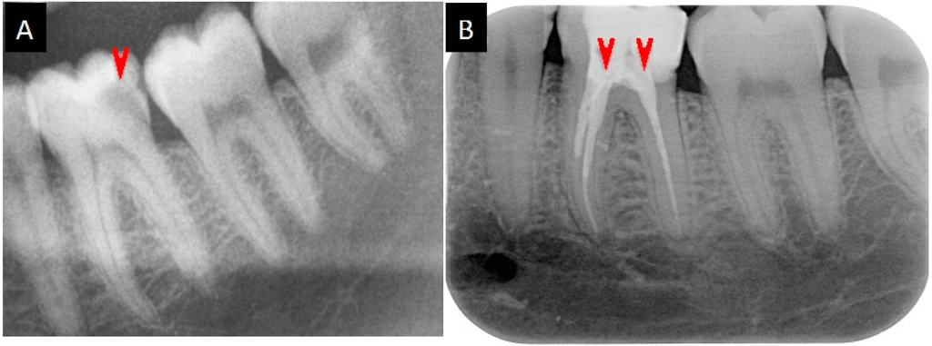 Molar 36 of a 25-year-old male patient before and after treatment. (A) The radiolucent area in the X-ray image indicates decay. (B) The sealed root canals after treatment with GS. The red arrowheads mark the decayed area and the sealed root canals, respectively.