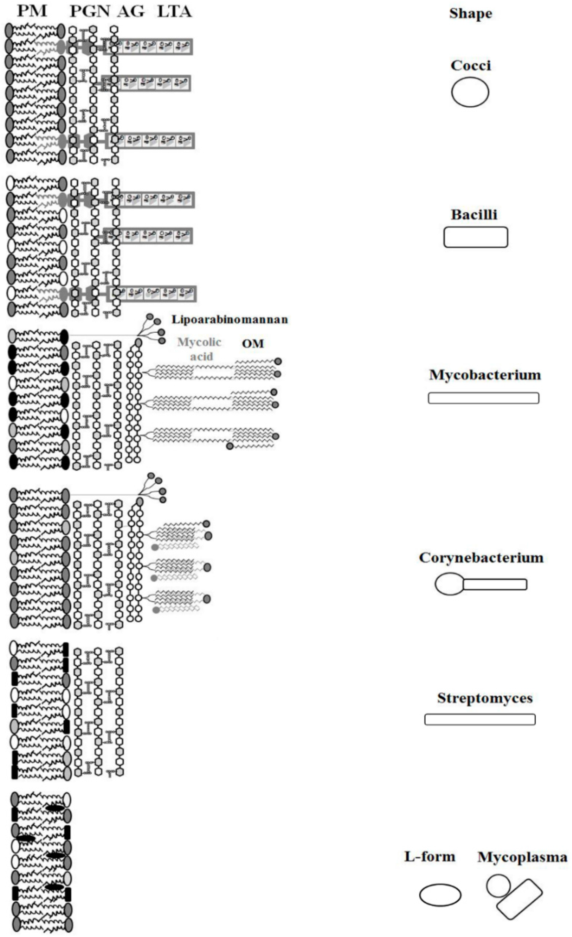 Schematic representation of membrane organization and morphology of selected Gram-positive bacteria. Gram-positive bacteria are characterized by a phospholipid bilayer of different composition (white ellipsoid, neutral phospholipid; grey ellipsoid, anionic phospholipid; black ellipsoid, cholesterol; black squares, neutral lipid). With the exception of L-form bacteria and mycoplasma, the plasma membrane (PM) of most Gram-positive bacteria is covered by peptidoglycan (PGN), which is a major component of the bacterial cell wall. The cell wall of cocci and bacilli contain also lipoteichoic acid (LTA), whereas mycobacteria and corynebacteria contain arabinogalactan (AG) and outer membrane (OM) composed of mycolic acid, sugar and lipids.