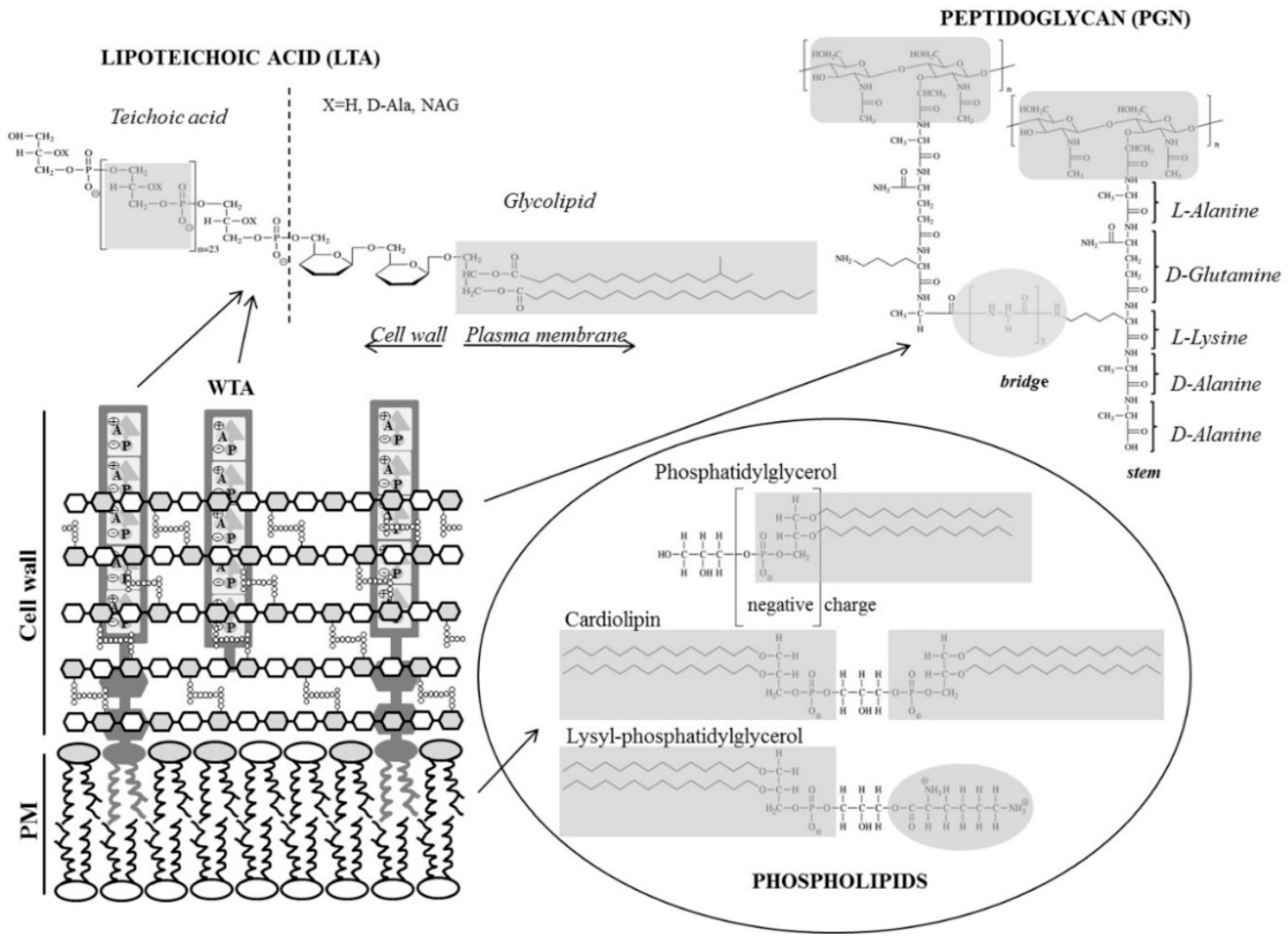 Schematic illustration of the cell envelope and main components of cell wall and plasma membrane (PM) of S. aureus, as a representative of Gram-positive bacteria.
