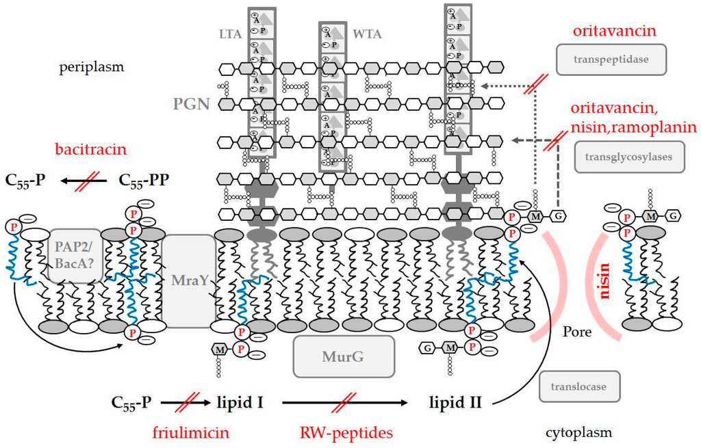 Bacitracin, a common antibiotic used for the treatment of bacterial infections caused by Gram-positive bacteria, targets the C55-isoprenyl (undecaprenyl) pyrophosphate carrier (C55-PP), another essential molecule in PGN biosynthesis. This antibiotic is a mixture consisting of cyclic polypeptides produced by Bacillus subtilis and Bacillus licheniformis. In contrast to most AMPs, the overall charge of bacitracin is neutral. The commercial products contain 70% bacitracin A, a dodecapeptide of 1.4 kDa, which is the most potent, as well as an amphipathic one within the mixture that undergoes complexation with C55-PP in the presence of divalent metal ions [168]. The consequence is inhibition of de-phosphorylation of this carrier catalyzed by PAP2 (type 2 phosphatidic acid phosphatase) and BacA (C55-PP phosphatase) and results in the inability of the cell to transport this carrier from the outer to the inner membrane leaflet necessary for the cell wall synthesis in the growing cell (Figure 4).
