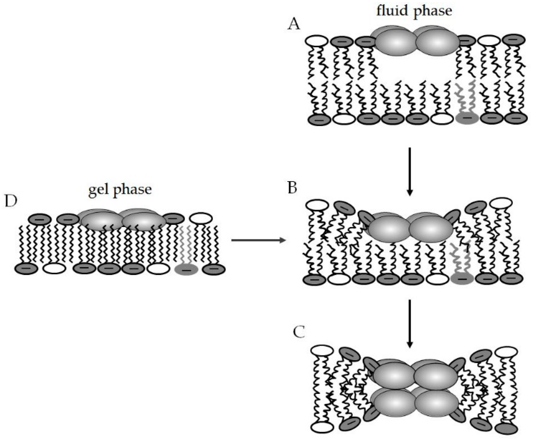 Scheme of proposed pore formation of daptomycin modified from [231]. Insertion of the peptide in the membrane interface and oligomerization creates a void in the hydrophobic core (A) inducing local positive curvature accompanied by deeper penetration of the peptide complex (B). This results in a dimple formation with a locally strongly decreased membrane thickness [236]. The oligomeric daptomycin may flip to the inner membrane leaflet and eventually combine with a complex of the outer leaflet to form a toroidal pore (C). Note, in the gel phase the void can be compensated by interdigitation of the lipid’s acyl chains (D) as shown for several AMPs [234].