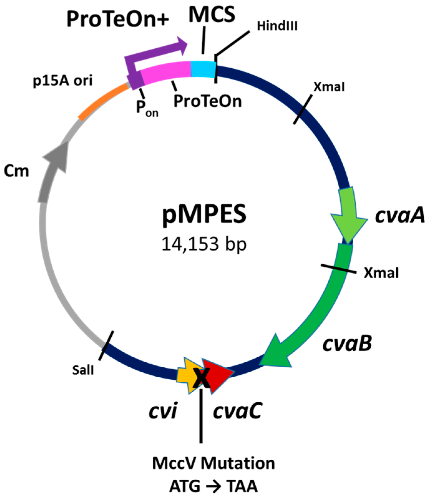 Diagram of pMPES (Modular Peptide Expression System). ProTeOn+: synthetic DNA promoter; Pon: promoter region; ProTeOn: activator protein; cvaA/cvaB: MccV section machinery; cvaC: MccV peptide (native); cvi: MccV immunity protein; Cm: Chloramphenicol resistance; MCS: Multiple Cloning Site.