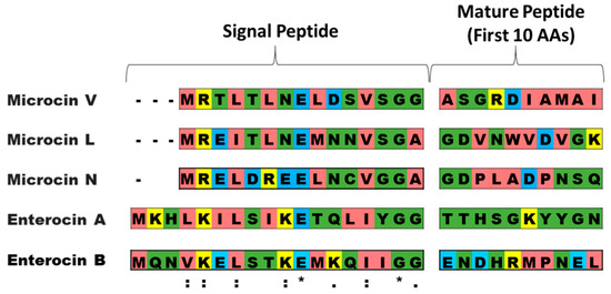 - Håvarstein, L.S.; Holo, H.; Nes, I.F. The leader peptide of colicin V shares consensus sequences with leader peptides that are common among peptide bacteriocins produced by Gram-positive bacteria. Microbiology 1994, 140, 2383–2389. [Google Scholar] [CrossRef] [PubMed]