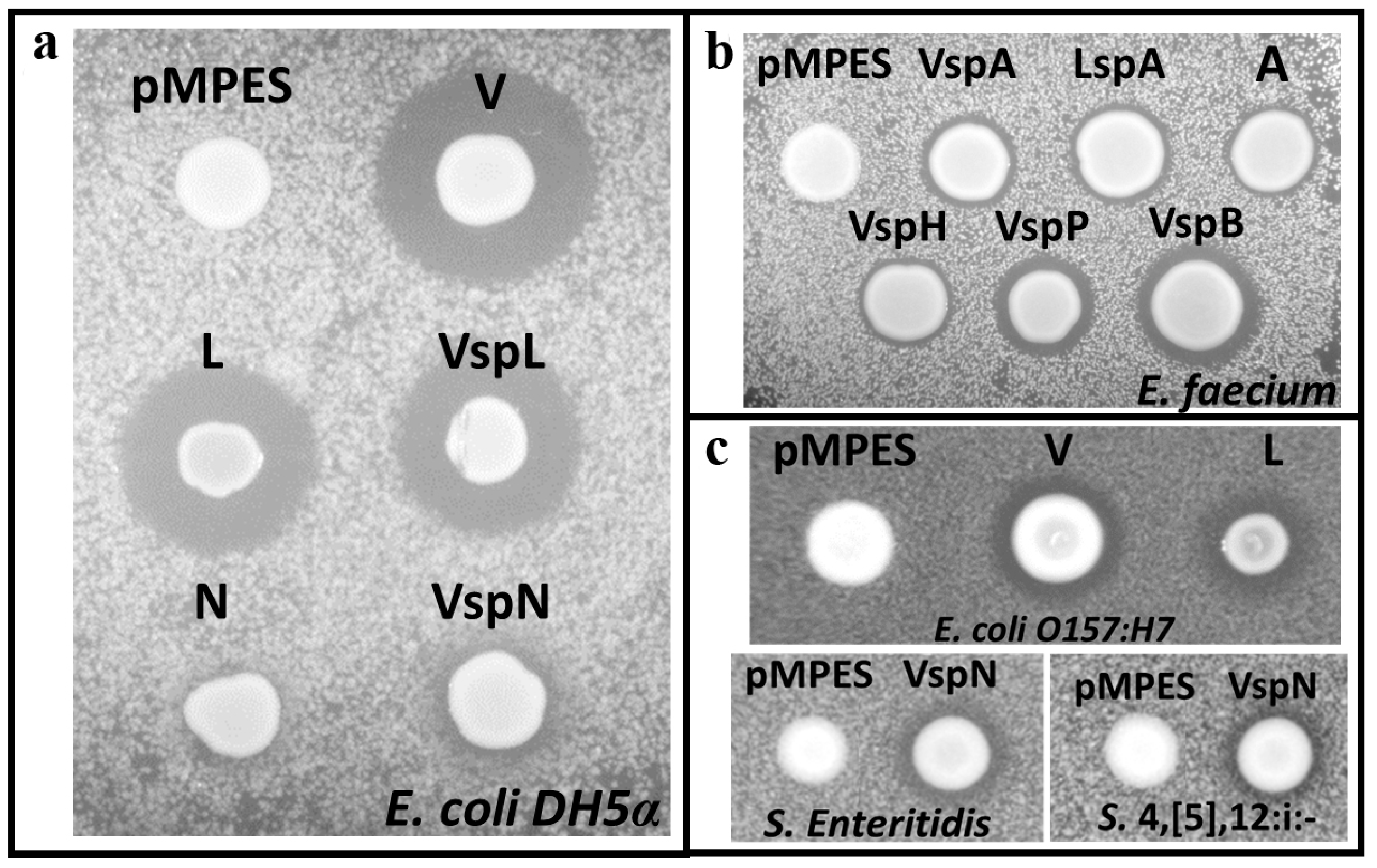 (a) Activity of MccV, MccL and McnN from E. coli MC1061F’ using the pMPES production system. E. coli DH5α was used as the indicator strain on this agar plate; (b) Production and secretion of EntA, HirJM79, EntP and EntB from E. coli MC1061F’ using pMPES. E. faecium 8E9 was used as the indicator strain on this agar plate; (c) Inhibition of E. coli O157:H7 by E. coli MC1061F’ pMPES:V and L (top) and Salmonella enterica serovar Enteritidis and Salmonella enterica serovar 4,[5],12:i:- by pMPES:VspN. In the figure, Vsp and Lsp indicate the use of the MccV or MccL signal peptide rather than naturally-encoded signal peptide.