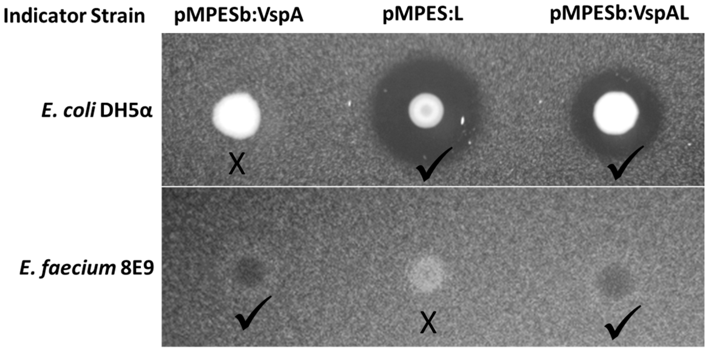 In Figure 3a, one can see clear zones of inhibition around E. coli MC1061 F’, pMPES:V, L, VspL and VspN. These results strongly suggest that all of these strains are producing and secreting inhibitory levels of their respective peptides.