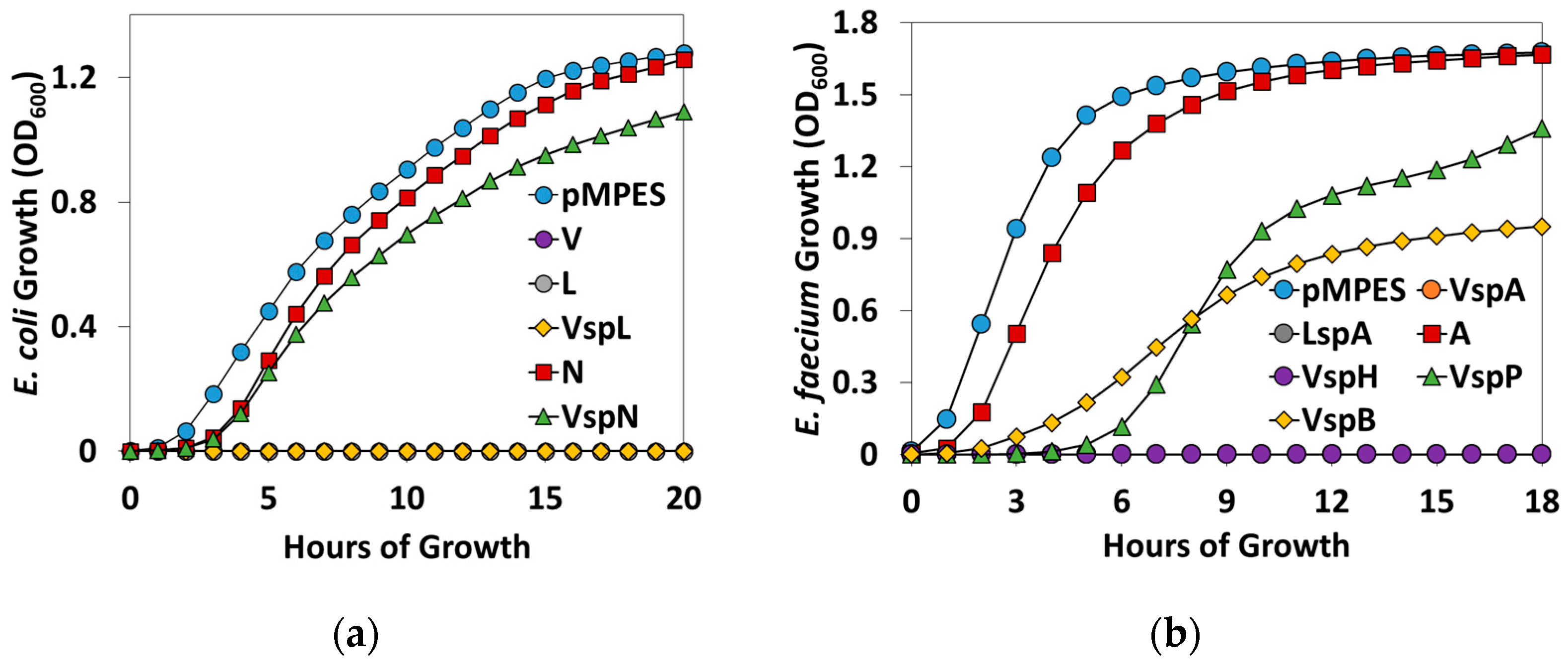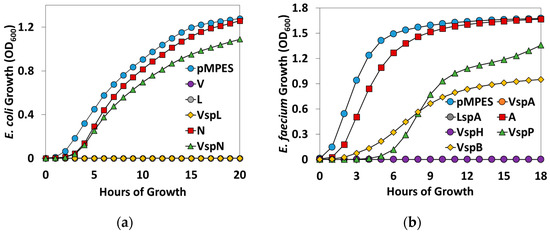 Liquid inhibition assays of the pMPES construct supernatants against: (a) E. coli DH5α and (b) E. faecium 8E9. Cultures are grown in 75% supernatant, 25% rich medium. Note, the V, L, VspL, VspA, LspA and VspH curves remain at OD600 = 0 on their respective graphs.