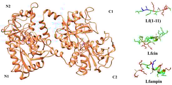 - Anderson, B.F.; Baker, H.M.; Dodson, E.J.; Norris, G.E.; Rumball, S.V.; Waters, J.M.; Baker, E.N. Structure of human lactoferrin at 3.2-Å resolution. Proc. Natl. Acad. Sci. USA 1987, 84, 1769–1773. [Google Scholar] [CrossRef] [PubMed]