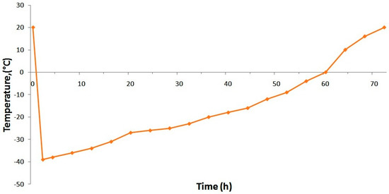 To stabilize ormustine the PF solution, some trial lyophilizations were conducted under various conditions. We evaluated the effectiveness of the proposed mode on the parameters: lyophilization duration and the quality of the obtained lyophilizate (appearance, pH change, loss of DS during lyophilization, and humidity). Being a regime allowing obtainment of the lyophilizate with a good appearance, with little loss of the active ingredient in the shortest time, we selected a mode in which the formulation was frozen at −45 °C on a shelf of a freeze drying unit (a shelf temperature of −45 °C) and maintained this temperature for 3 h; then, the vacuum was switched on. After stabilization of the vacuum, the condenser, and the formulation temperature, heating was performed at the rate of +5 °C/h up to a shelf temperature of −35 °C. Further temperature increase (after passage of the formulation eutectic zone that is −23 °C) was at +3 °C per hour. Upon reaching 0 °C on the formulation, we performed a gradual rise in temperature to +20 °C at +2 °C/h; after reaching a predetermined temperature for the preparation, a final drying (removal of residual moisture) was carried out over the course of 3 h (Figure 2).