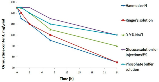 All solvents provided a true solution, but a significant increase in pH was ensured only through the application of a phosphate buffer solution. Further, in order to select the most appropriate solvent from the five proposed options, we assessed their impact on the stability of the resulting ormustine in the solution after rehydration. For this purpose, ormustine lyophilizate was dissolved in 5 mL of a 0.9% NaCl solution, a 5% glucose solution, a Ringer’s solution, Hemodes-N, and 10 mL of a phosphate buffer solution, and the concentration of active compound was measured at control time intervals—1 h, 3 h, 8 h, and 24 h. (Figure 3).