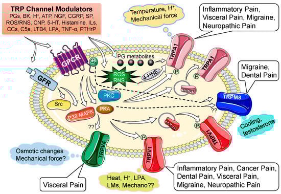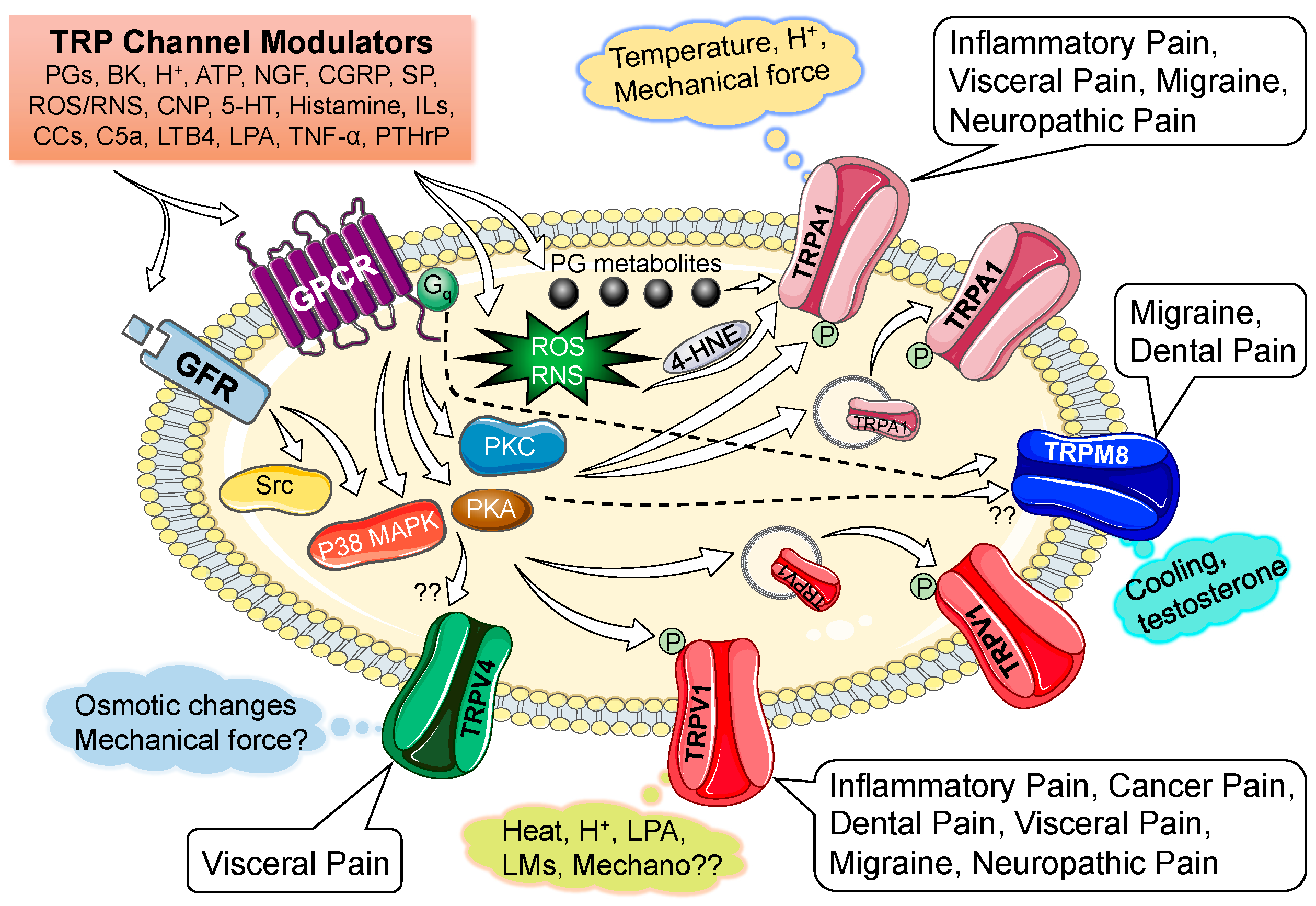 Scheme depicting specific activators and modulators of various nociceptive transient receptor potential (TRP) channels on mammalian sensory neurons. Involvement of individual TRP channels in specific pain-related pathologies are indicated/listed within call-out boxes. Abbreviations: 5-HT, serotonin; ATP, adenosine triphosphate; BK, bradykinin; CCs, chemokines; CGRP, calcitonin gene-related peptide; CNP, C-type natriuretic peptide; GFR, growth factor receptor; GPCR, G protein-coupled receptor; H+, protons; ILs, interleukins; LMs, lipid mediators; LPA, lysophosphatidic acid; LTB4; leukotriene B4; NGF, nerve growth factor; p38 MAPK, p38 mitogen-activated protein kinase; PGs, prostaglandins; PKA, cAMP-dependent protein kinase; PKC, protein kinase C; PTHrP, parathyroid hormone-related peptide; ROS, reactive oxygen species; RNS, reactive nitrogen species; SP, substance P or neurokinin; Src; src-type protein kinase; TRPA1, transient receptor potential sub-family ankyrin, member-1; TRPM8, transient receptor potential sub-family melastatin, member-8; TRPV1, transient receptor potential sub-family vanilloid, member-1; TRPV4, transient receptor potential sub-family vanilloid, member-4.