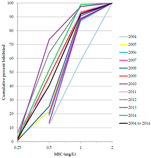 Cumulative minimum inhibitory concentration (MIC) distribution of vancomycin against methicillin-resistant Staphylococcus aureus, Italy 2004 to 2014.