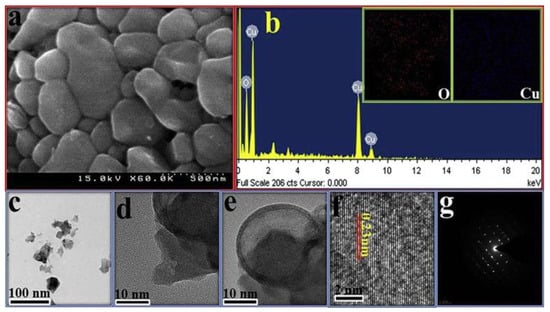 Microscopic images of CuO NPs synthesized by a green method: (a) scanning electron microscopy (SEM) image; (b) EDAX spectrometry of the CuO NPs; inset: elemental mapping of oxygen and copper; (c–e) transmission electron microscopy (TEM) images at different magnifications; (f) high magnification view of the CuO NPs; and (g) Selected Area Electron Diffraction (SAED) pattern of the CuO NPs [39].