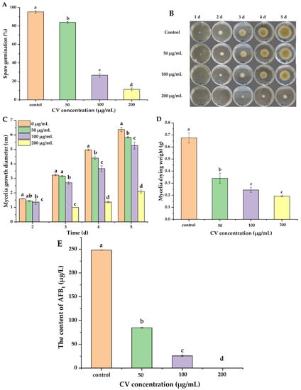 Antifungal activity of CV on A. flavus. (A) Spore germination, (B,C) colony growth diameter, (D) mycelia weight and (E) the content of AFB1. Different letters indicated significant differences (p < 0.05).