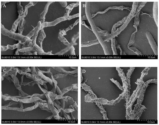 Mycelia were cultured as described in Section 2.3.3; 5-mm × 10-mm segments were filtered from mycelia and washed twice by 0.1-M phosphate-buffered saline (PBS, pH 7.2). The samples were fixed by 2.5% glutaraldehyde solution for a fixed 24 h and washed three times in 0.2-M phosphate-buffered saline (PBS, pH 7.4) for 15 min each time. The segments were dehydrated twice in graded ethanol in a series (15–100%) over a period of time for 20 min each time, then air-dried, fixed on the radio with a conductive adhesive, sprayed with gold for 30 s and, finally, observed by SEM. Samples were fixed by 2.5% glutaraldehyde solution for 24 h and washed three times in 0.2-M phosphate-buffered saline (PBS, pH 7.4) for 15 min each time. Sections were dehydrated twice (15–100%) in graded ethanol in series for 20 min each time, then air dried, fixed on radio with conductive gel, sprayed with gold for 30 s and, finally, observed by SEM.