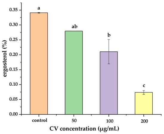 Ergosterol is a key component of the fungal cell membrane, which is an important substance to maintain membrane integrity and normal physiological function of fungal cells. It is also considered as a marker for estimating fungal biomass in different matrices []. The ergosterol content in the plasma membrane of A. flavus was determined, and the inhibition result of CV on the synthesis of ergosterol can be seen in Figure 3. The total ergosterol content was determined at 0-, 50-, 100- and 200-μg/mL concentrations of CV with values of 0.341 ± 0.001%, 0.230 ± 0.000%, 0.210 ± 0.041% and 0.074 ± 0.006%, respectively. Furthermore, the ergosterol contents of A. flavus mycelium after 100-μg/mL and 200-μg/mL CV treatment were significantly different from the control. The reduction of ergosterol content in A. flavus following treatment with different concentrations of CV suggested that the inhibitory effect of CV on the ergosterol content in the A. flavus cell membrane was shown in a dose-dependent manner.