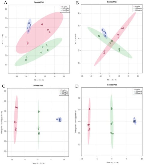 As shown in Figure 4A,B, the explained variance by the first two principal components in the control group (red dots), 100 μg/mL (green dots) and 200 μg/mL group (blue dots) were 24.5% (PC1) and 12.7% (PC2) in the positive mode and 21.1% (PC1) and 11.7% (PC2) in the negative mode. Furthermore, the blurred boundary among the areas occupied groups can be seen in the negative mode. In order to obtain clearer separations, a supervised pattern recognition method, OPLS-DA, was used to discover significant discriminants among the samples. In the OPLS-DA score plots, the control, 100- and 200-μg/mL CV-treated groups were clearly distinguished in positive and negative modes. To ensure that the calculated models were reliable, 100 times the permutation was performed with the model parameters in positive mode (R2Y = 0.997, Q2 = 0.858) and negative mode (R2Y = 0.999, Q2 = 0.706), showing a more predictive performance and goodness-of-fit results (Figure 4C,D). Both positive and negative mode datasets presented clear segregation among the three groups, showing that the lipid metabolism of A. flavus was affected by CV significantly.